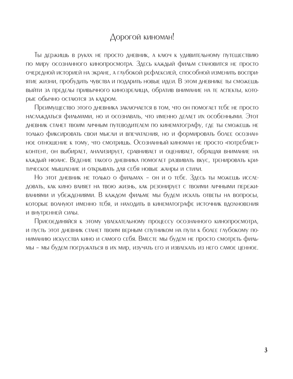 Этот дневник создан специально для тех, кто не просто любит кино, но и стремится смотреть фильмы осознанно, анализируя их художественные и философские аспекты. Записывайте свои мысли и эмоции от просмотренных картин, размышляйте над сюжетами, персонажами и режиссёрскими решениями. Дневник поможет вам углубить понимание кинематографа, отслеживать развитие собственного вкуса и осознавать, как фильмы влияют на ваше восприятие мира. Это ваше личное пространство для погружения в глубины киноискусства, позволяющее смотреть не только глазами, но и сердцем.
