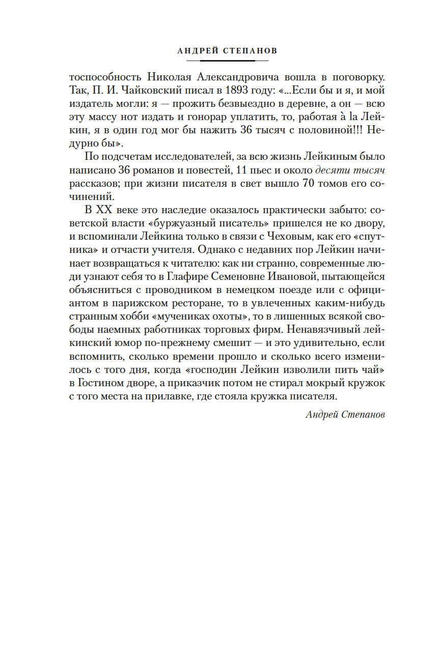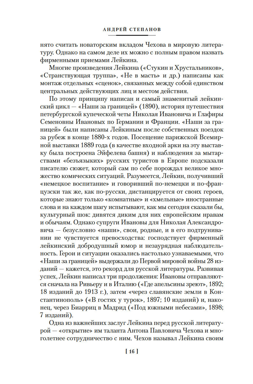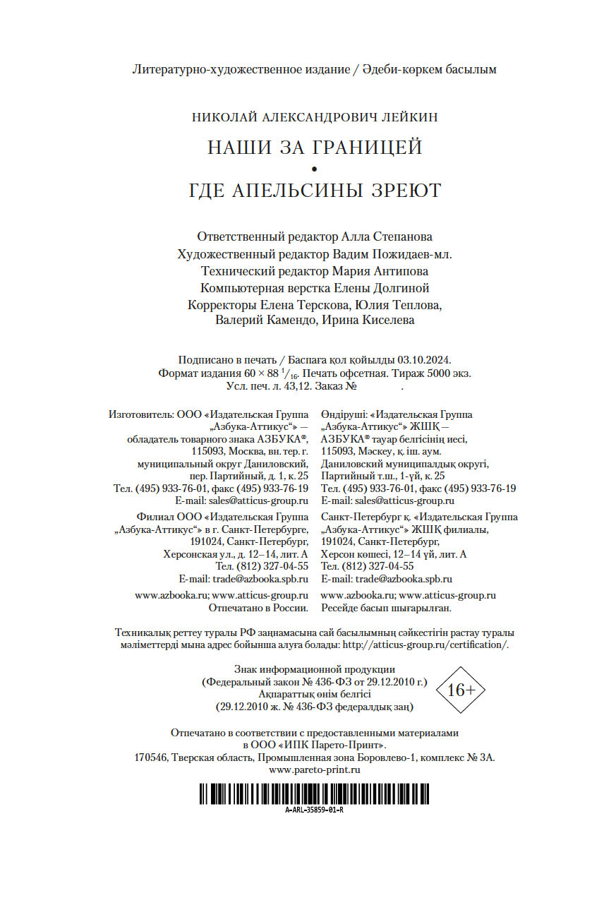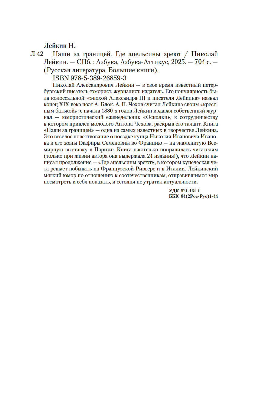Николай Александрович Лейкин – в свое время известный петербургский писатель-юморист, журналист, издатель. Его популярность была колоссальной: "эпохой Александра III и писателя Лейкина" назвал конец XIX века поэт А. Блок. А. П. Чехов считал Лейкина своим "крестным батькой": с начала 1880-х годов Лейкин издавал собственный журнал – юмористический еженедельник "Осколки", к сотрудничеству в котором привлек молодого Антона Чехова, раскрыв его талант. Книга "Наши за границей" – одна из самых известных в творчестве Лейкина. Это веселое повествование о поездке купца Николая Ивановича Иванова и его жены Глафиры Семеновны во Францию – на знаменитую Всемирную выставку в Париже. Книга настолько понравилась читателям (только при жизни автора она выдержала 24 издания!), что Лейкин написал продолжение – "Где апельсины зреют", в котором купеческая чета решает побывать на Французской Ривьере и в Италии. Лейкинский мягкий юмор по отношению к соотечественникам, отправившимся мир посмотреть и себя показать, и сегодня не утратил актуальности.