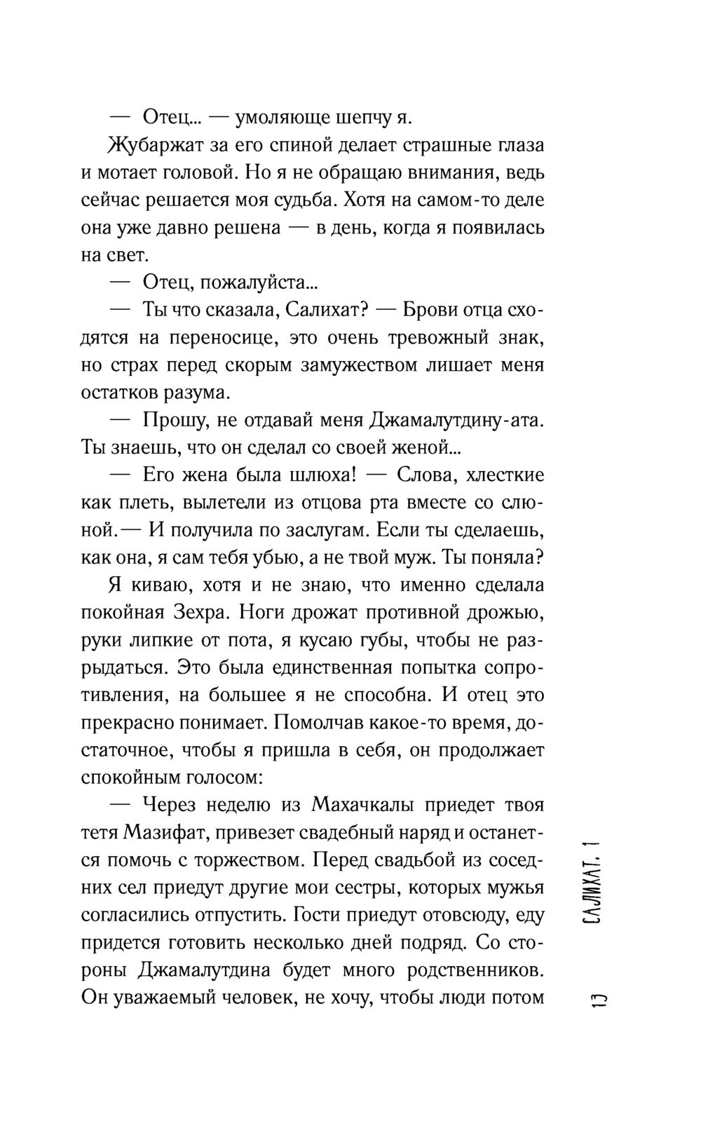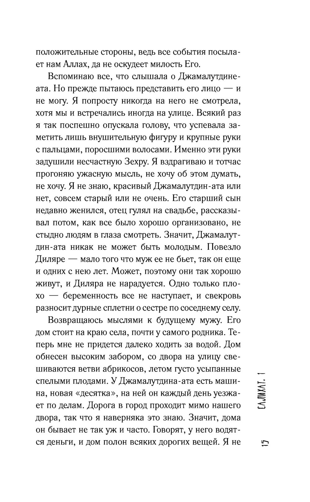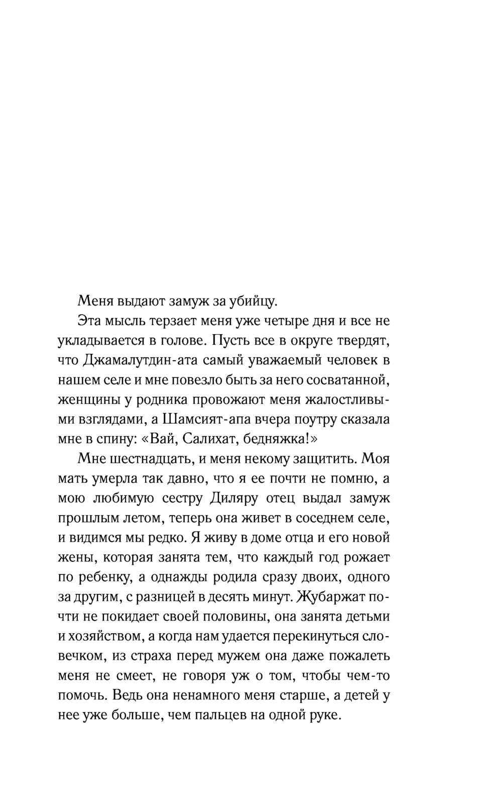 Салихат живет в дагестанском селе, затерянном среди гор. Как и все молодые девушки, она мечтает о счастливом браке, основанном на взаимной любви и уважении. Но отец все решает за нее. Салихат против воли выдают замуж за вдовца Джамалутдина. Девушка попадает в незнакомый дом, где ее ждет новая жизнь со своими порядками и обязанностями. Ей предстоит угождать не только мужу, но и остальным домочадцам: требовательной тетке мужа, старшему пасынку и его капризной жене. Но больше всего Салихат пугает таинственное исчезновение первой жены Джамалутдина, красавицы Зехры... Новая жизнь представляется ей настоящим кошмаром, но что готовит ей будущее – еще предстоит узнать.