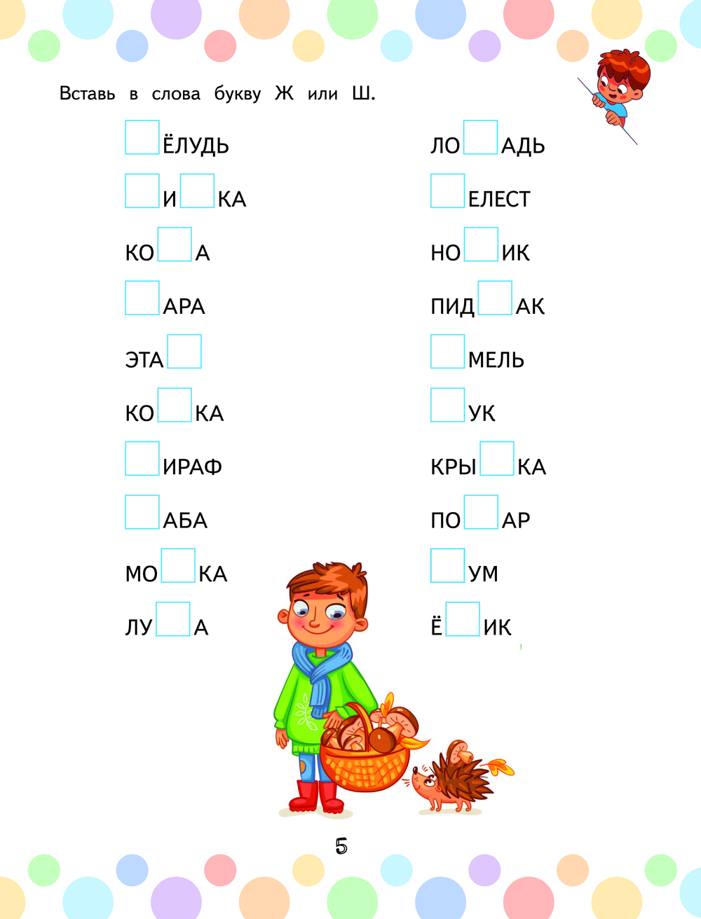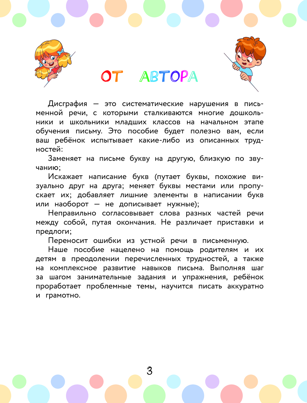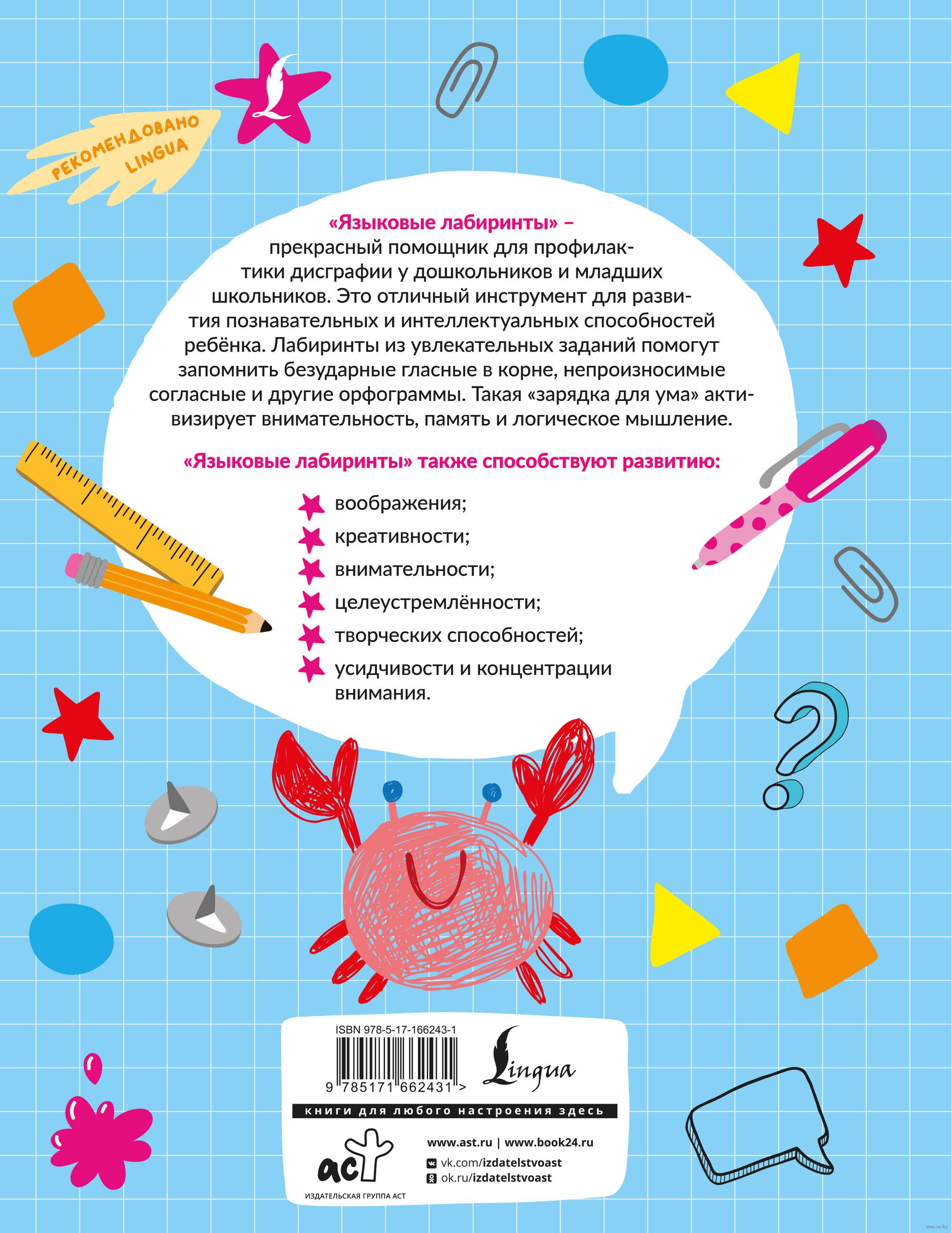 Дисграфия – частая проблема у дошкольников и младших школьников. Многих родителей пугает, когда ребёнок путает и часто пропускает буквы, меняет их местами, делает множество ошибок. Эта книга поможет справиться с дисграфией и предотвратить разные ошибки на письме. Увлекательные задания охватывают основные темы, которые проходят в начальной школе: ЖИ-ШИ, ЧА-ЩА, ЧУ-ЩУ, безударные гласные в корне, непроизносимые согласные и другие орфограммы. Красочная книга непременно заинтересует и порадует ребёнка.