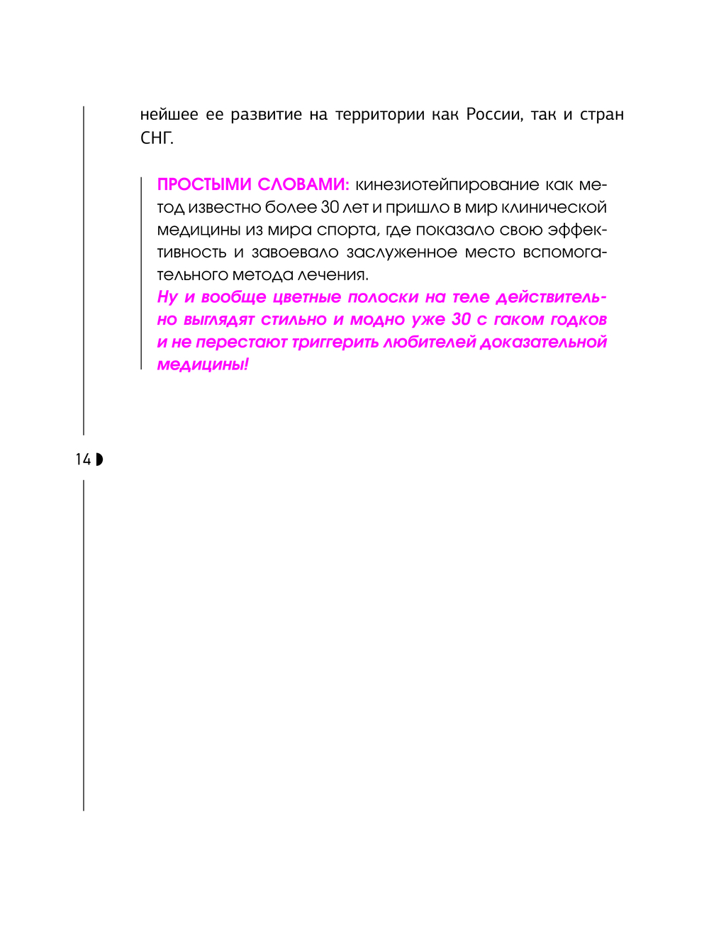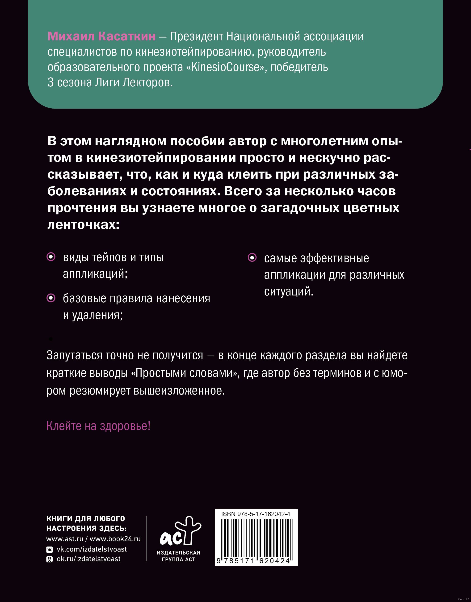 В этом наглядном пособии автор с многолетним опытом в кинезиотейпировании просто и нескучно рассказывает, что, как и куда клеить при различных заболеваниях и состояниях.