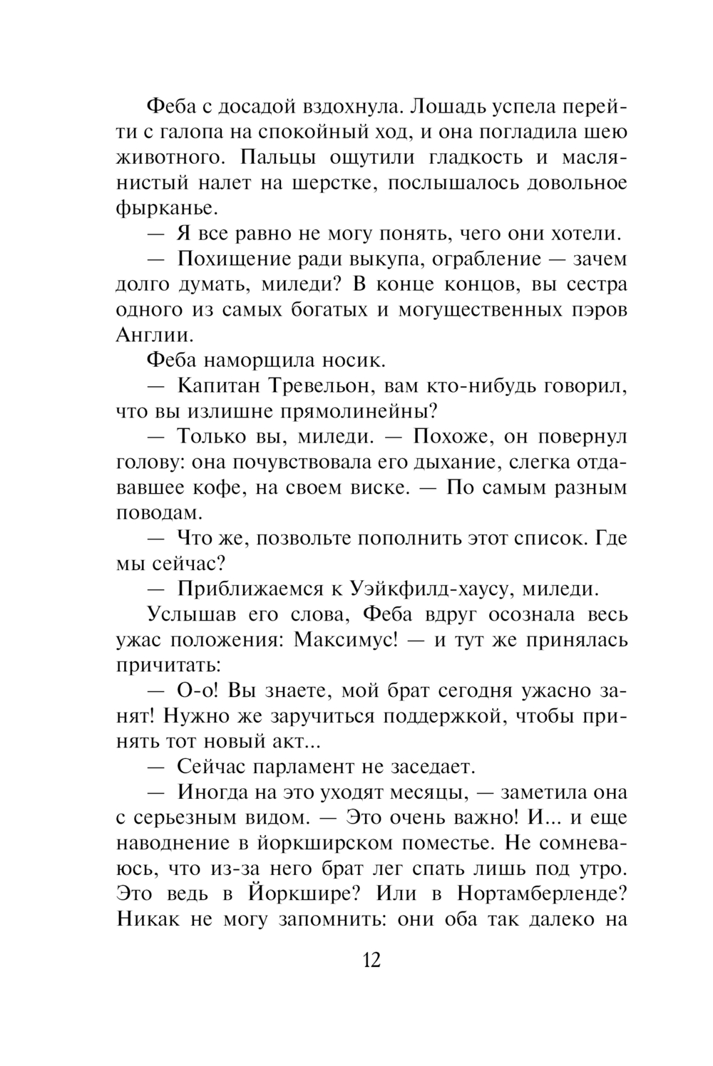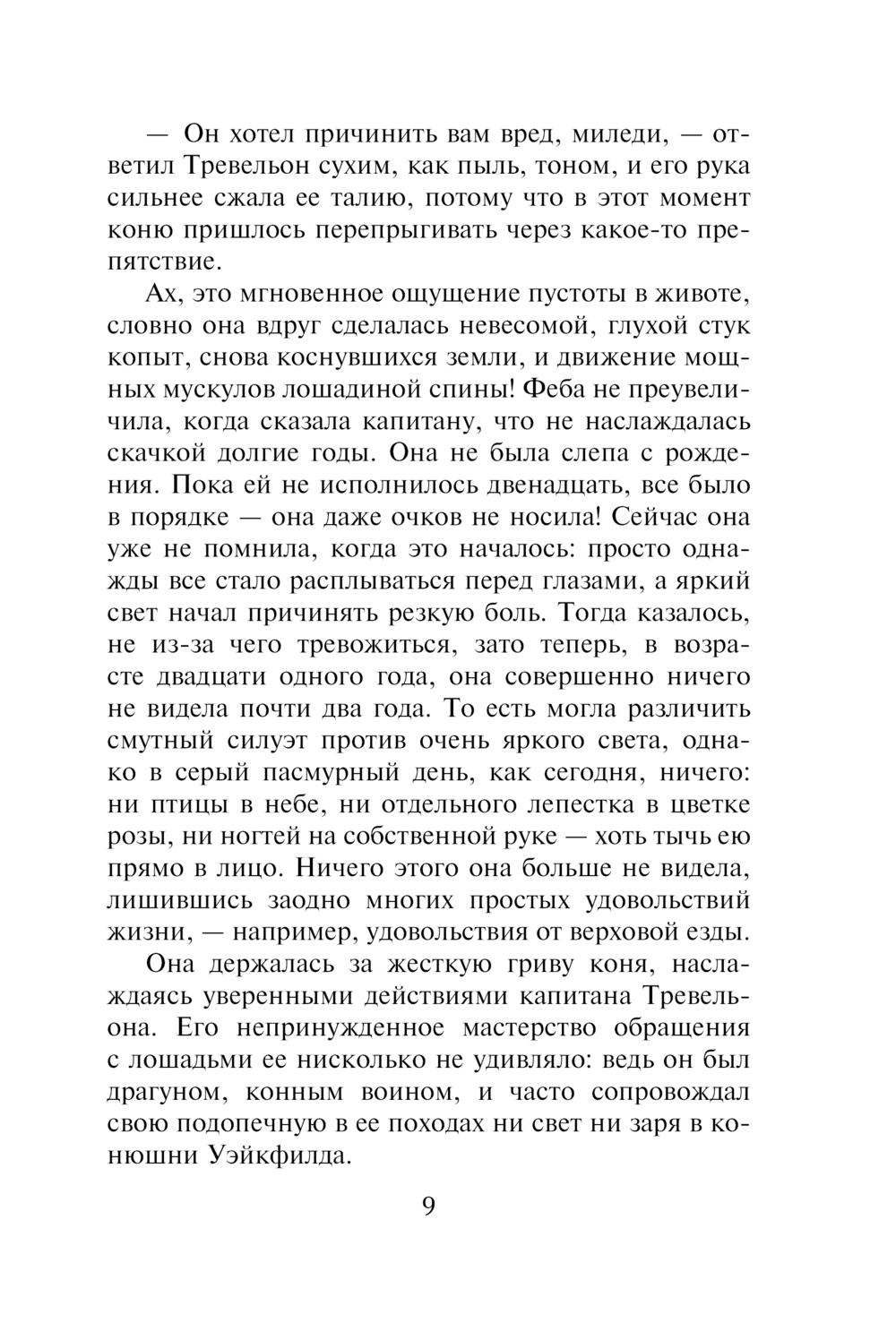 Леди Феба Баттен красива, остроумна, обладает живым и бойким характером... но, к сожалению, слепа. Опасаясь за нее, старший брат нанимает телохранителя, – закаленного в боях капитана Джеймса Тревельона, вынужденного распрощаться из-за последствий ранения с военной службой.