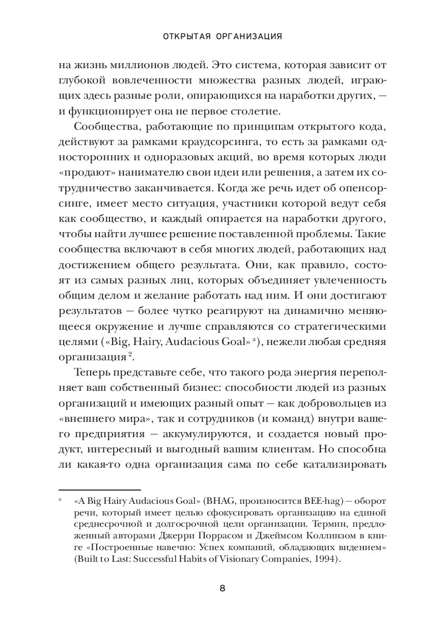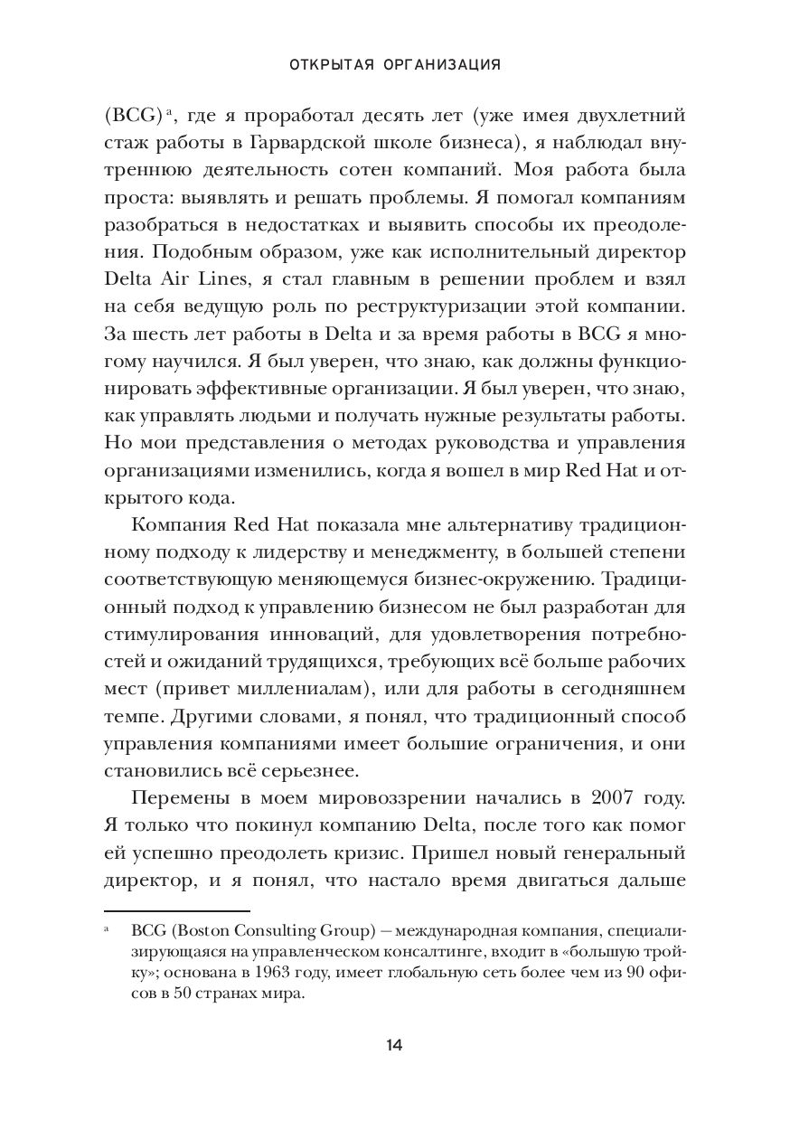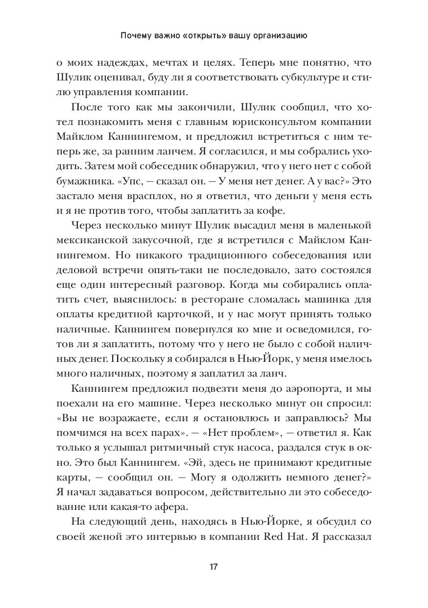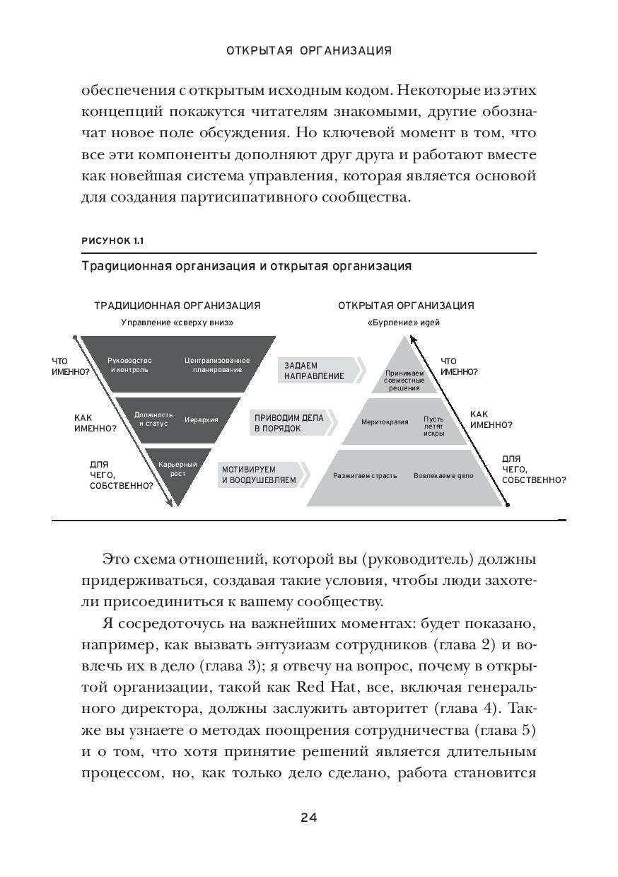 Автор подробно объясняет, каким образом структура открытой организации помогает развиваться талантам на разных должностях и культивирует в людях лояльность компании и энтузиазм, благодаря которым они способны свернуть горы.
