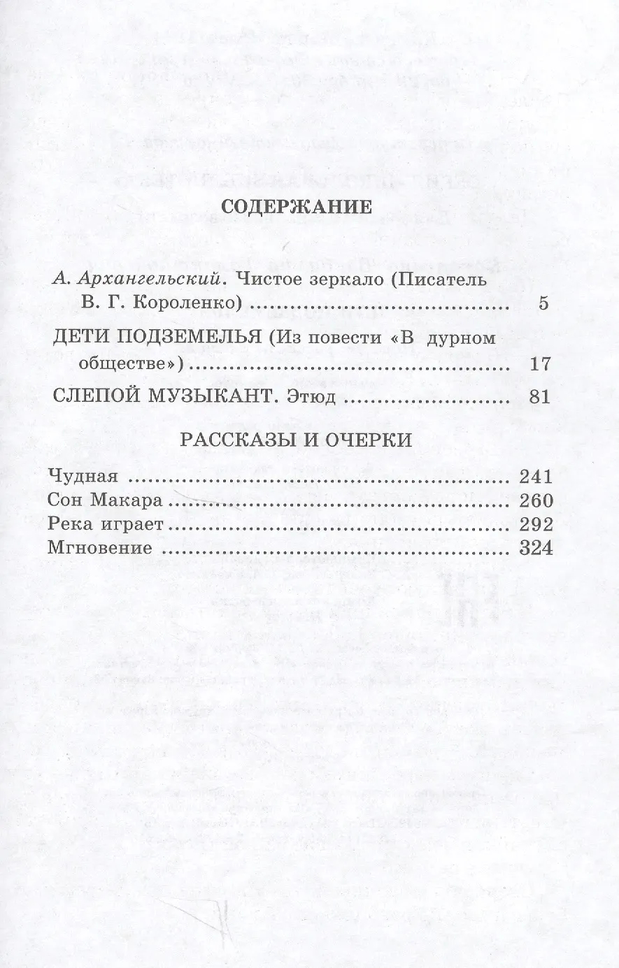 В книгу вошли известные произведения замечательного русского писателя В.Г. Короленко: повести "Дети подземелья" и "Слепой музыкант", рассказы "Сон Макара", "Река играет", очерки "Чудная" и "Мгновение".