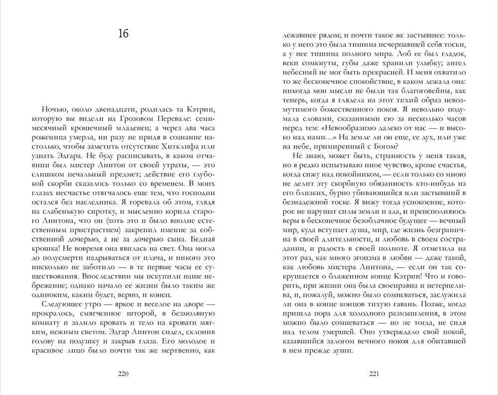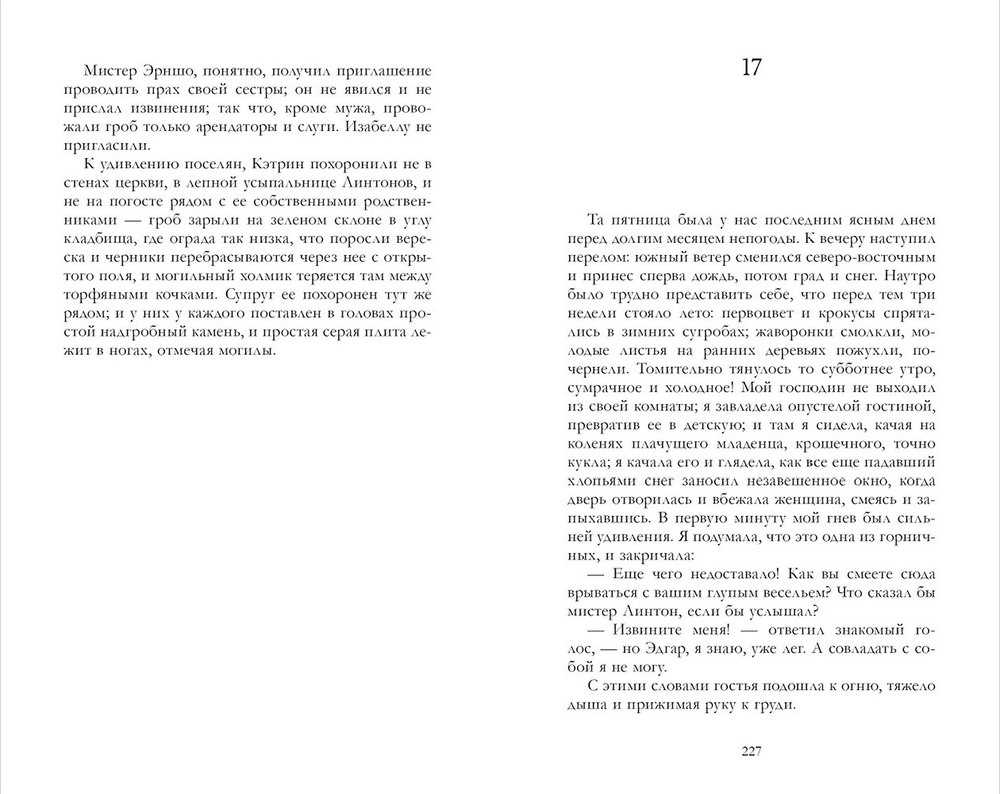 История любви и ненависти, страсти и мщения развивается в диких местах на севере Англии. Отношения Кэтрин Эрншо и Хитклиффа сложны и противоречивы, и приводят к трагическим последствиям для них самих и их семей. Сложные взаимоотношения персонажей, психологические драмы и готическая атмосфера создают мощную, незабываемую прозу, обнажающую самые темные стороны человеческой природы.