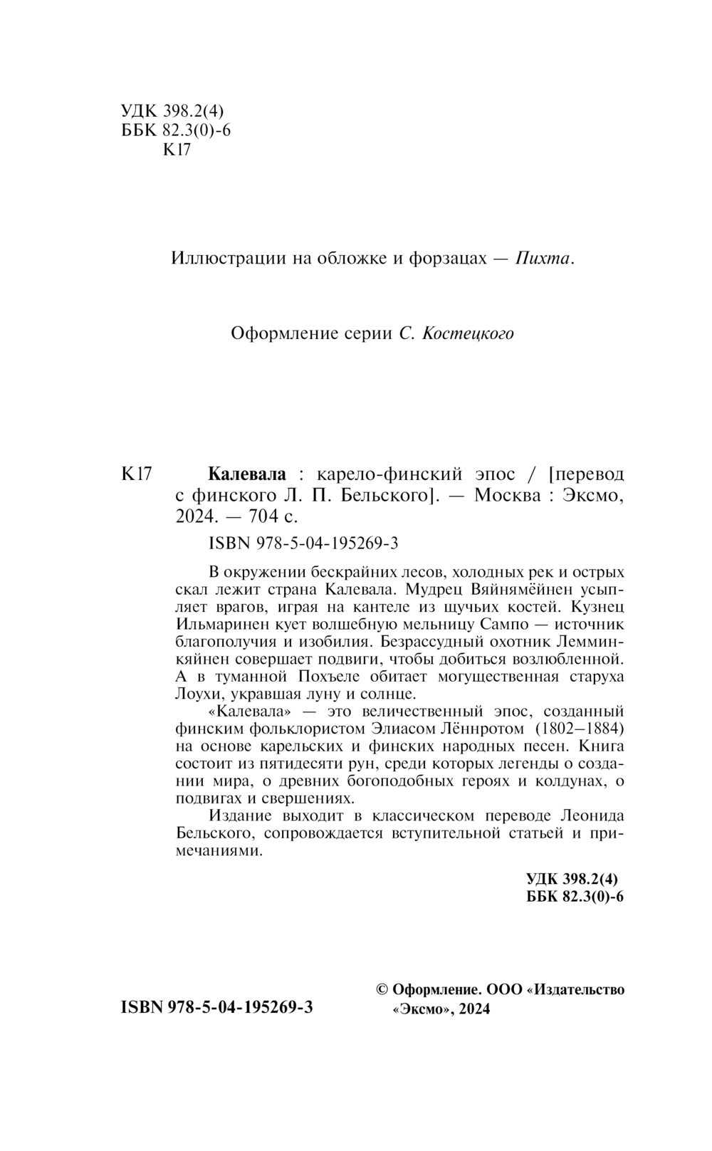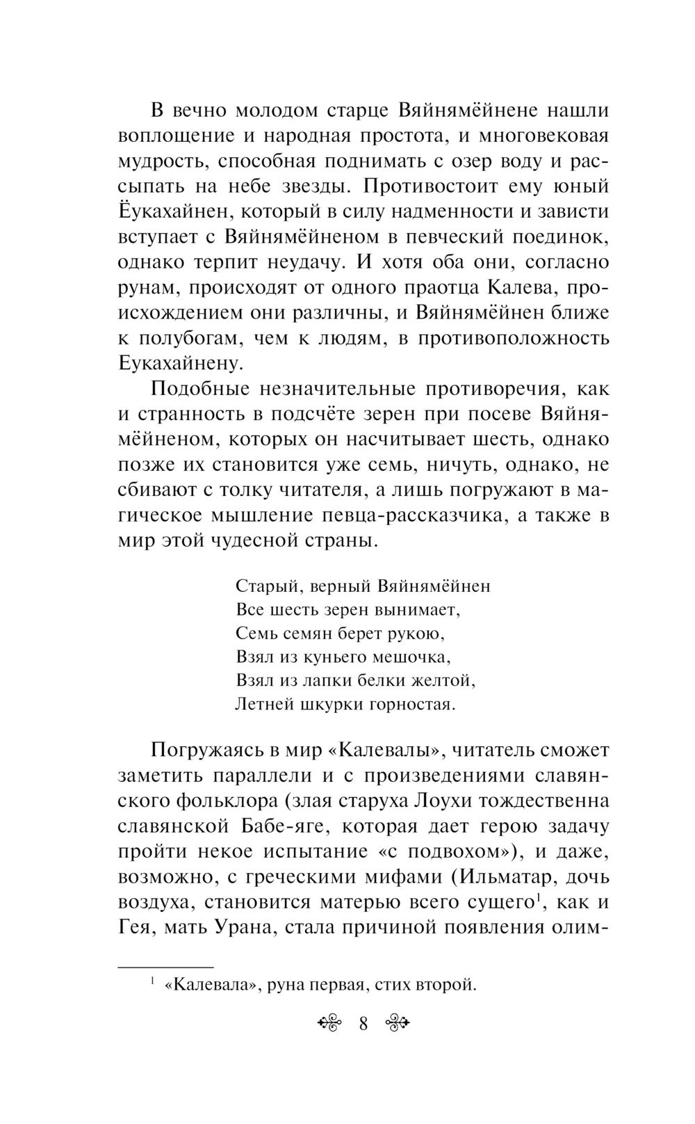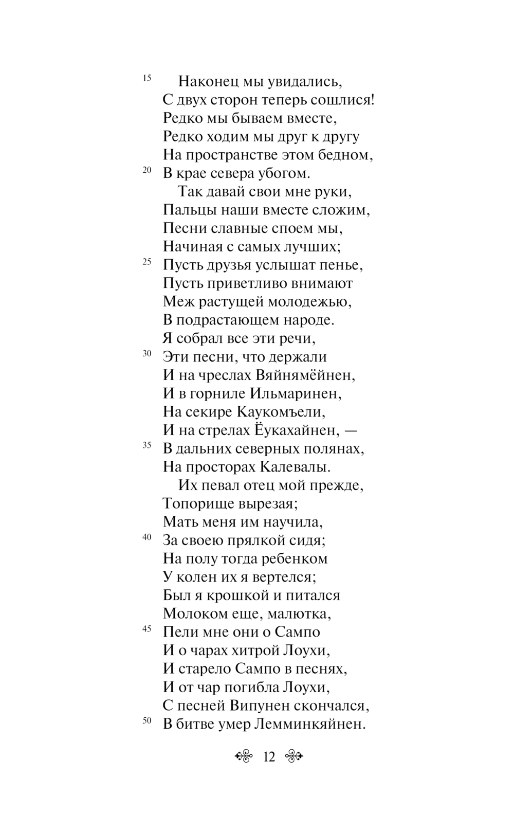 "Калевала" – это величественный эпос, созданный финским фольклористом Элиасом Лённротом (1802-1884) на основе карельских и финских народных песен. Книга состоит из пятидесяти рун, среди которых легенды о создании мира, о древних богоподобных героях и колдунах, о подвигах и свершениях.