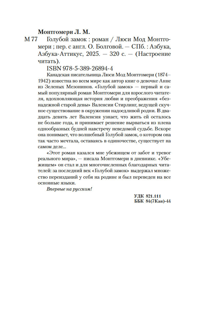 "Этот роман казался мне убежищем от забот и тревог реального мира", – писала Монтгомери в дневнике. "Убежищем" он стал и для многочисленных благодарных читателей: за последний век "Голубой замок" выдержал множество переизданий у себя на родине и был переведен на все основные языки.