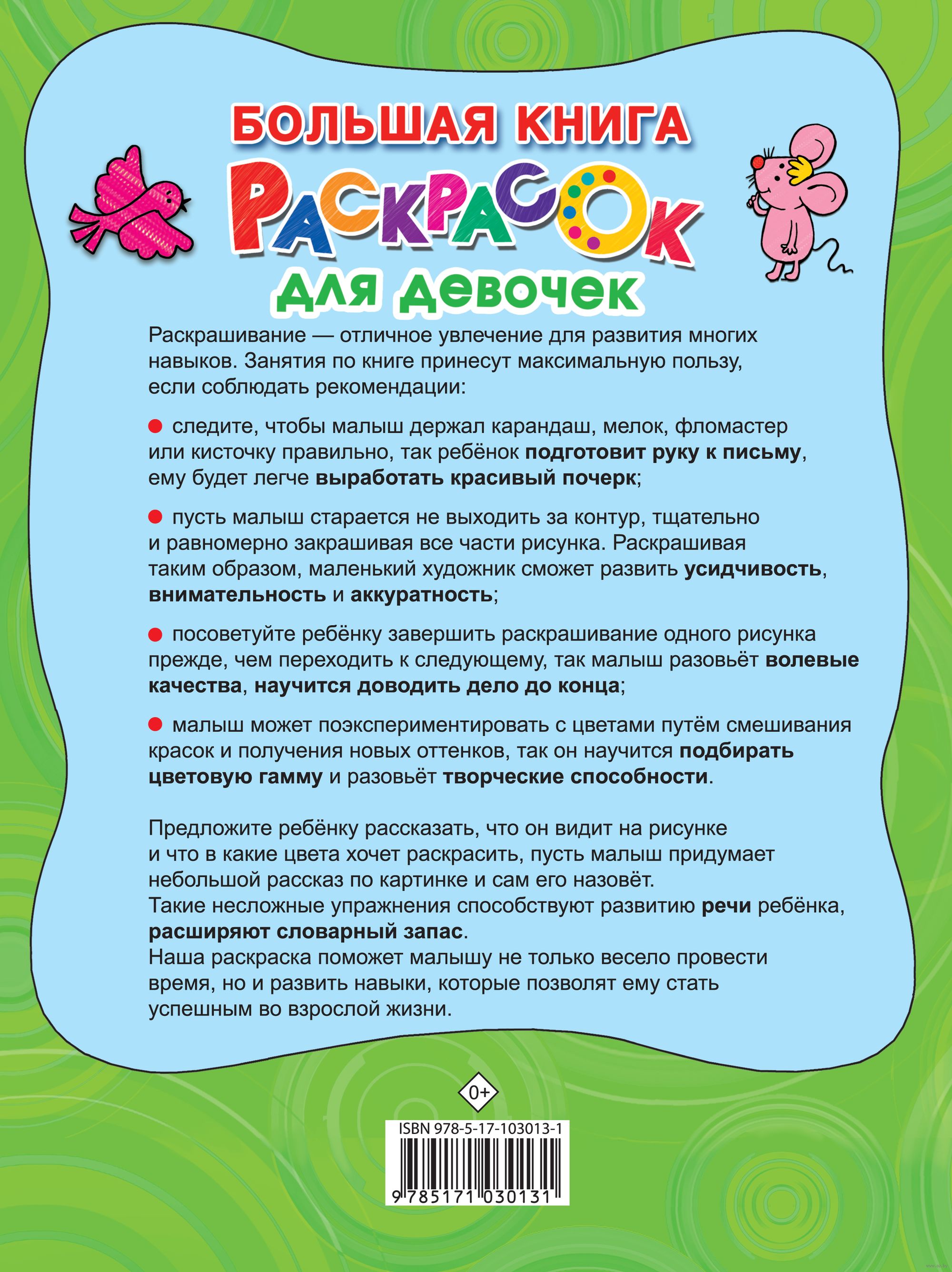 "Большая книга раскрасок для девочек" – это целая коллекция чудесных иллюстраций. Раскрашивая и читая короткие тексты, ребёнок сможет развить художественный вкус, внимание, мелкую моторику, научиться аккуратности, а также расширить словарный запас.