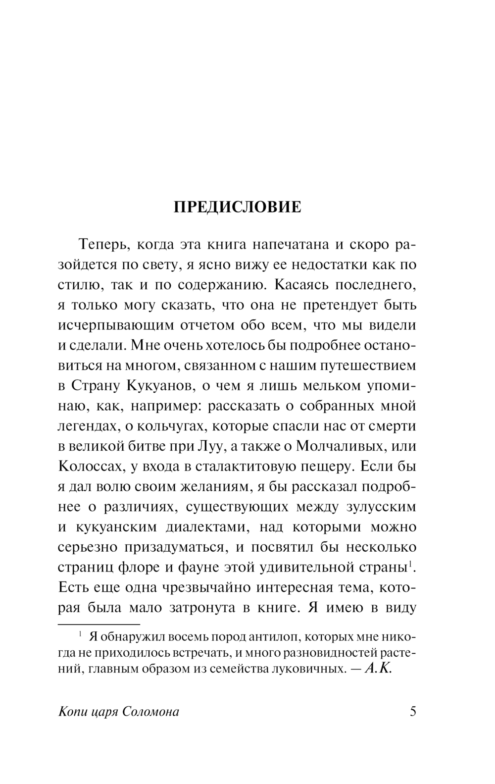 Вышедший в 1885 году роман "Копи царя Соломона" мгновенно стал классикой приключенческой литературы. Книга неоднократно допечатывалась, переиздавалась и адаптировалась для киноэкрана. Сам Хаггард написал еще с полторы дюжины продолжений о приключениях Аллана Квотермейна, но ни одно из них не повторило успех оригинала.