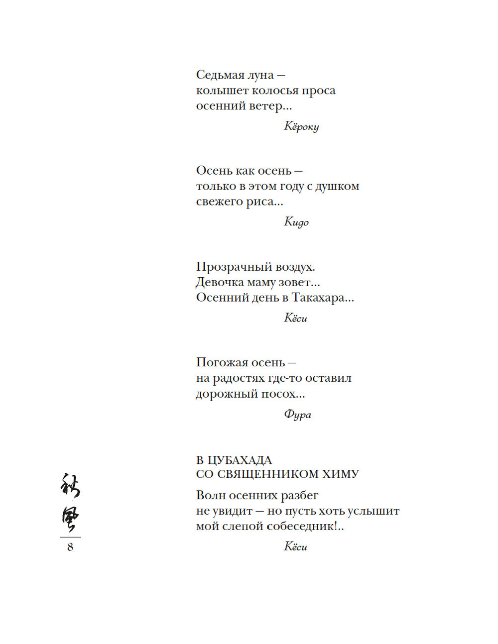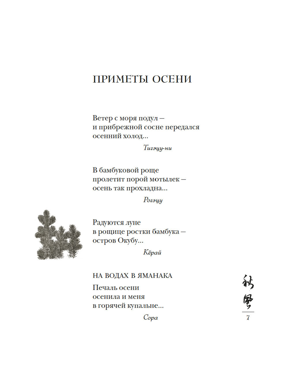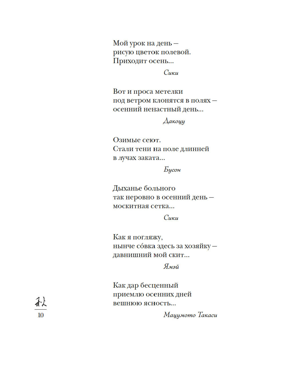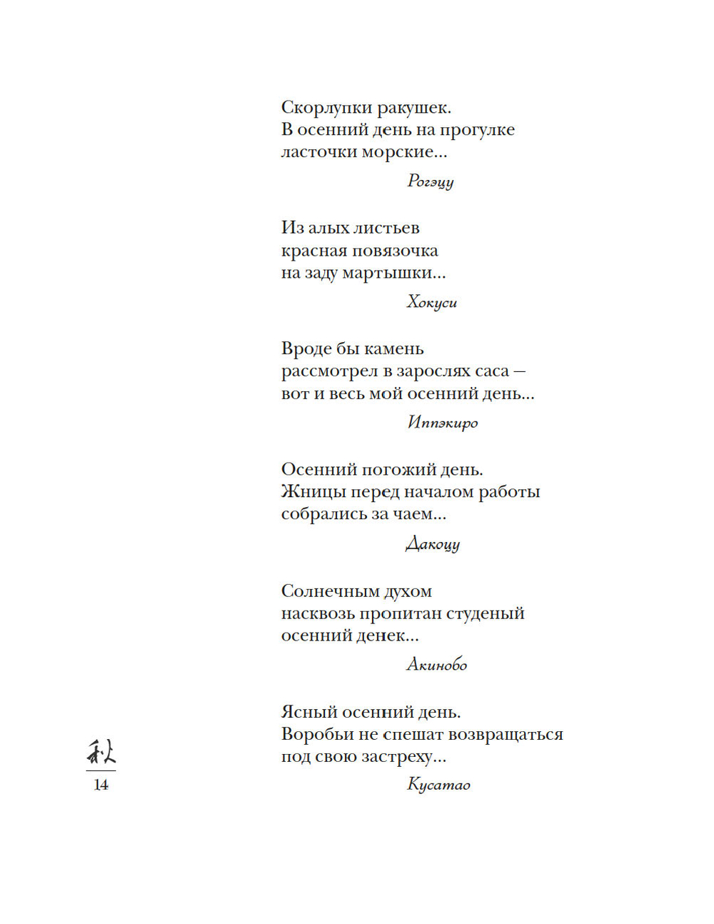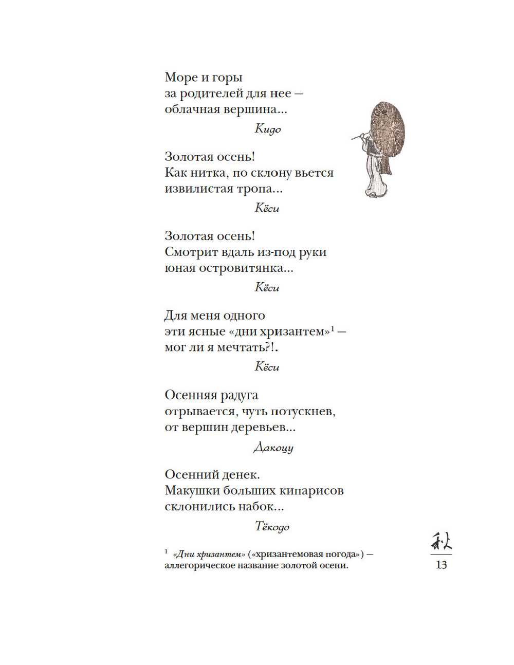 Утонченная и немногословная японская поэзия хайку всегда была отражением мира природы, воплощенного в бесконечной смене времен года. Человек, живущий обыденной жизнью, чьи пять чувств настроены на постоянное восприятие красоты земли и неба, цветов и трав, песен цикад и солнечного тепла, – вот лирический герой жанра, объединяющего поэзию, живопись и каллиграфию. Авторы хайку создали своего рода поэтический календарь, в котором отводилось место для разнообразных растений и животных, насекомых, птиц и рыб, для бытовых зарисовок и праздников.
