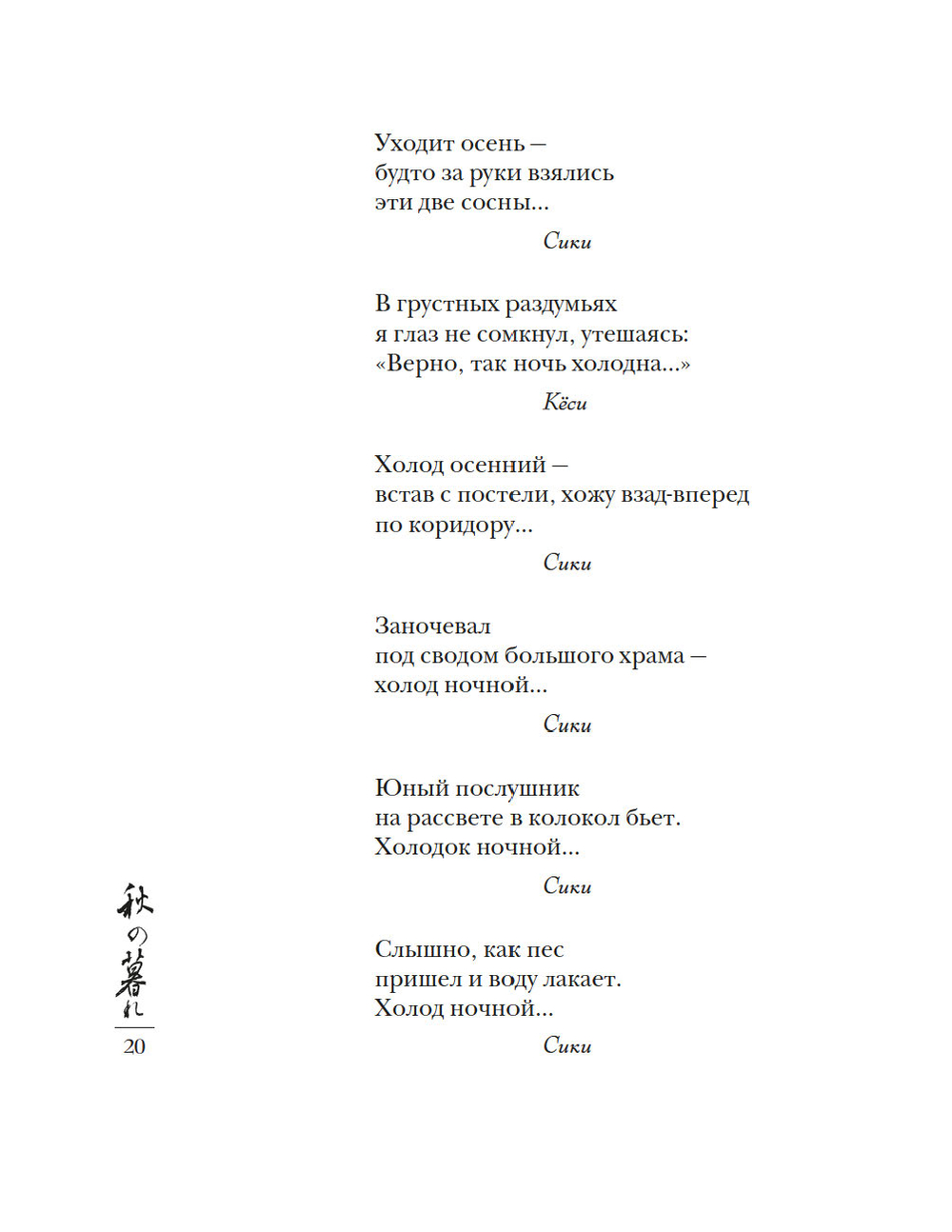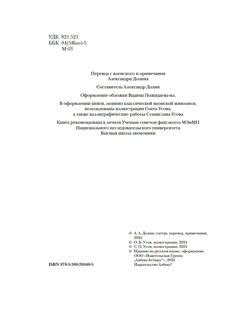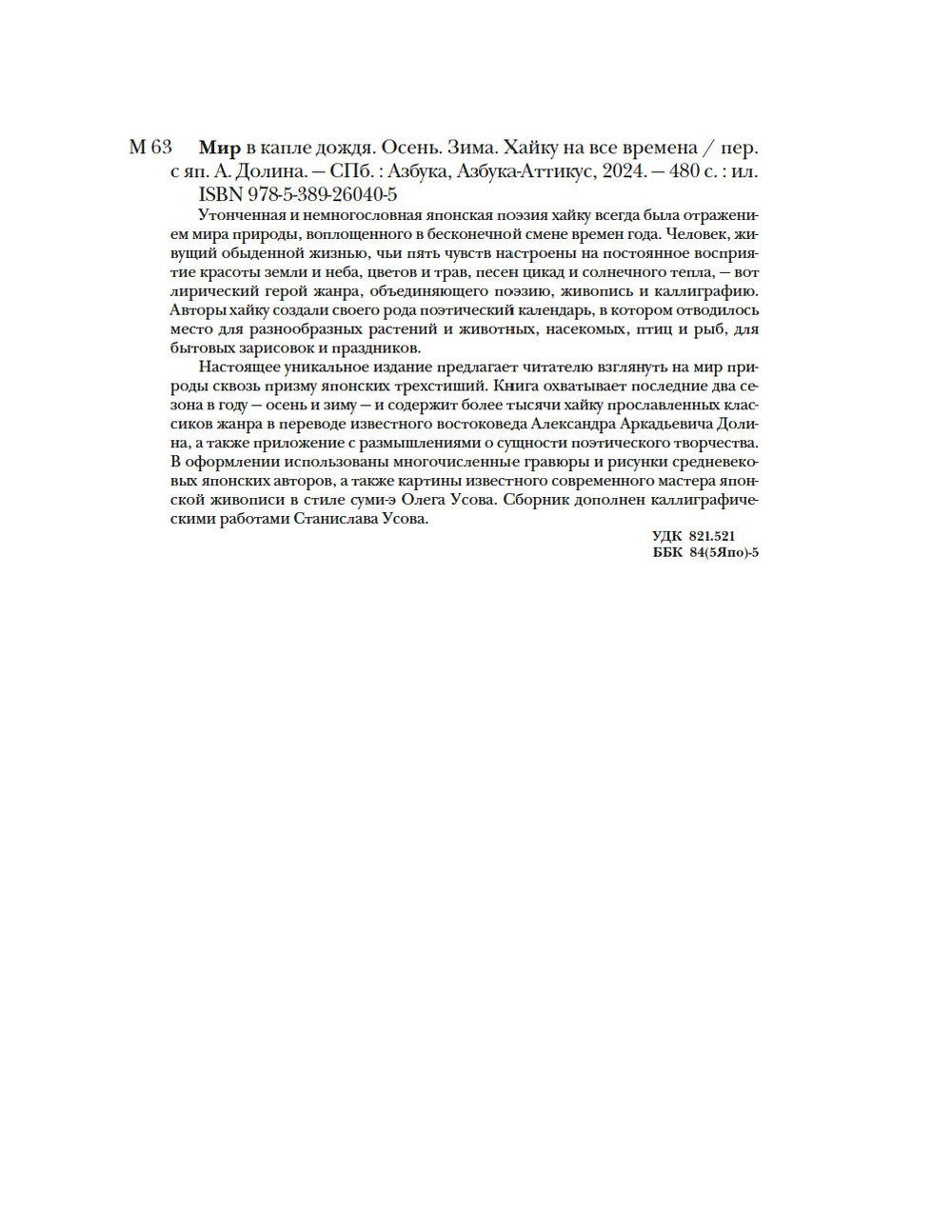 Настоящее уникальное издание предлагает читателю взглянуть на мир природы сквозь призму японских трехстиший. Книга охватывает последние два сезона в году – осень и зиму – и содержит более тысячи хайку прославленных классиков жанра в переводе известного востоковеда Александра Аркадьевича Долина, а также приложение с размышлениями о сущности поэтического творчества. В оформлении использованы многочисленные гравюры и рисунки средневековых японских авторов, а также картины известного современного мастера японской живописи в стиле суми-э Олега Усова. Сборник дополнен каллиграфическими работами Станислава Усова.