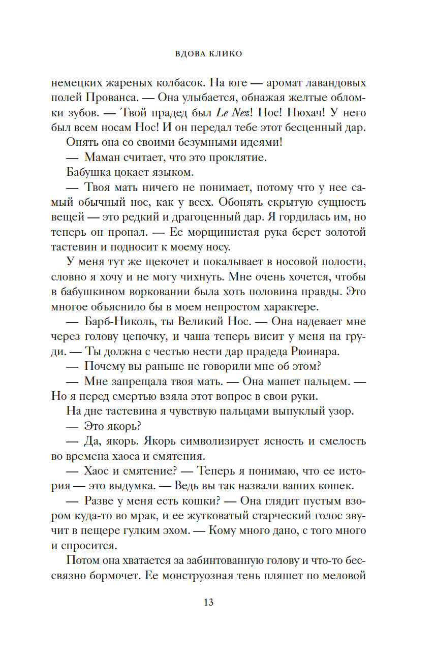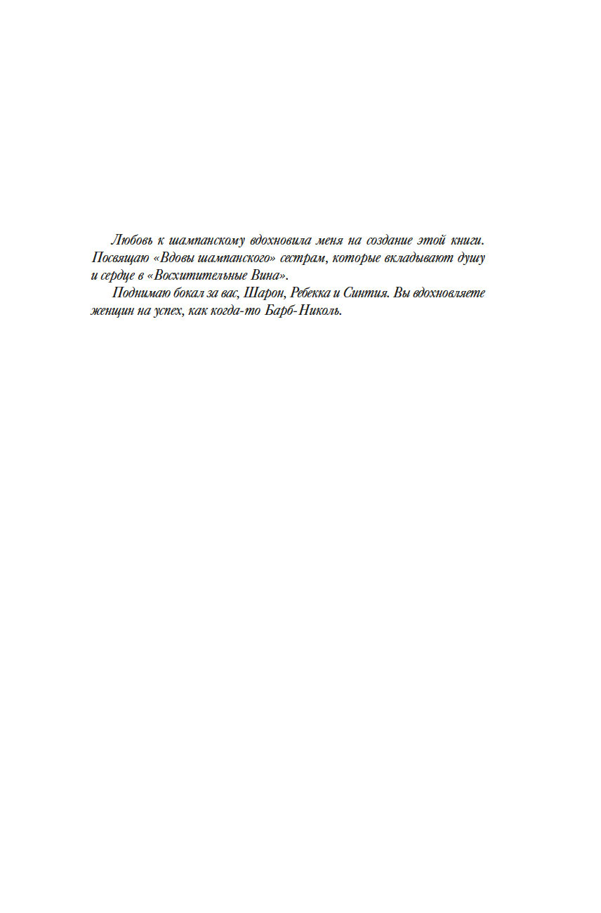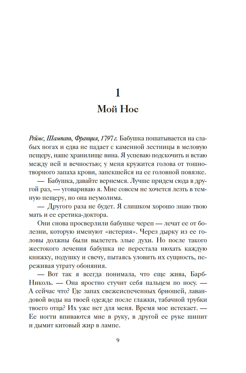 Впечатляющая сага о первой из "Вдов шампанского" Франции, Барб-Николь Клико. Обладая редким даром, известным как "Le Nez" (Нос), Барб-Николь способна создавать невероятные купажи, а также обонять "вонь лжи или благоухание чистого сердца. Или разрывающий сердце запах несбывшейся надежды". Кроме этого дара она обладает смелостью и верой в себя; преодолевает немыслимые трудности в годы действия кодекса Наполеона, который оставлял вдов без прав на собственность – а в случае Барб-Николь без ее винодельни, без ее шампанского. Сюжет, искусно переплетенный с историческими письмами Наполеона, переносит читателя в разгар турбулентной французской жизни начала XIX века, когда Барб-Николь Клико-Понсарден, создала свою империю – великую империю шампанского.