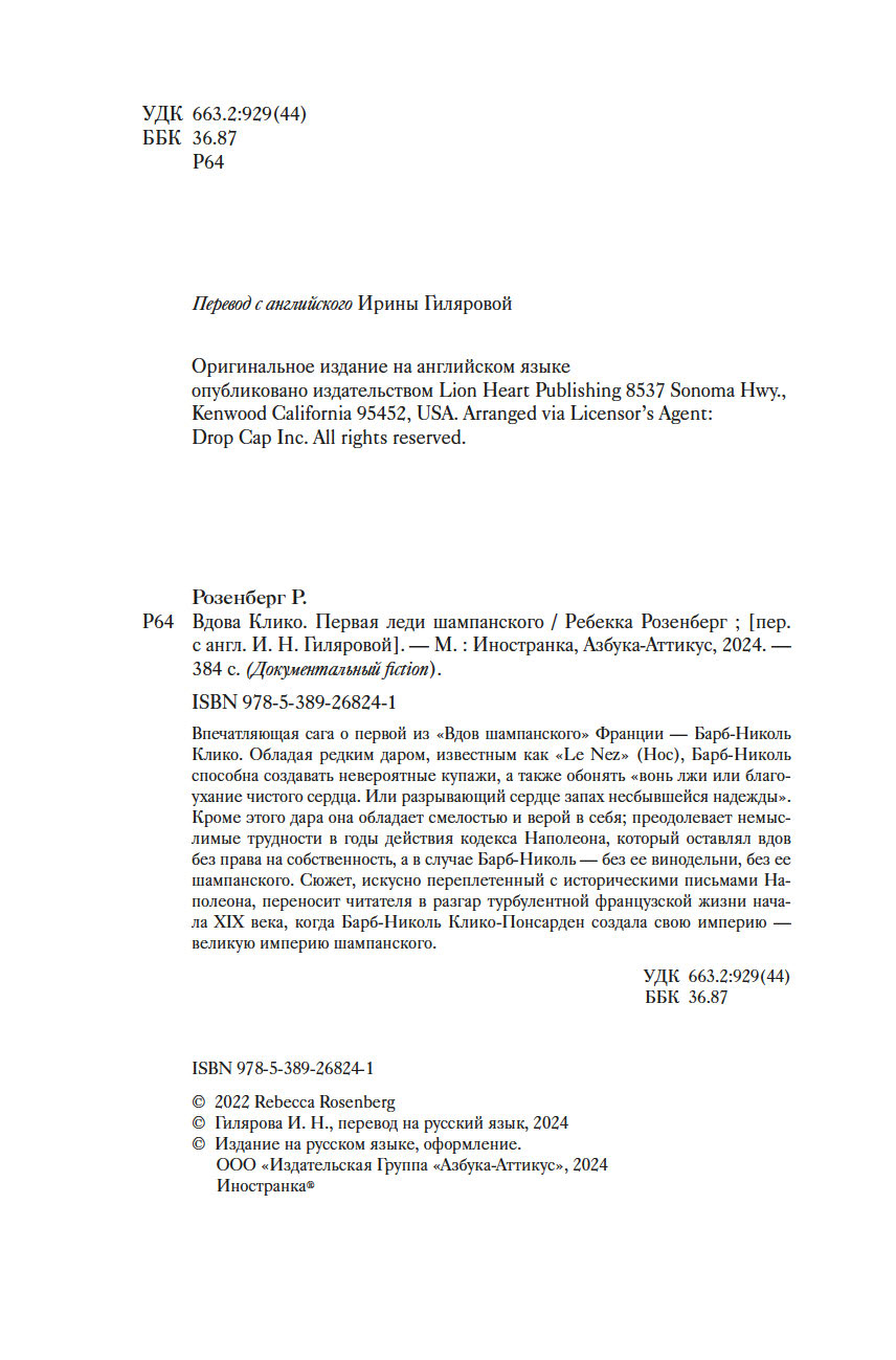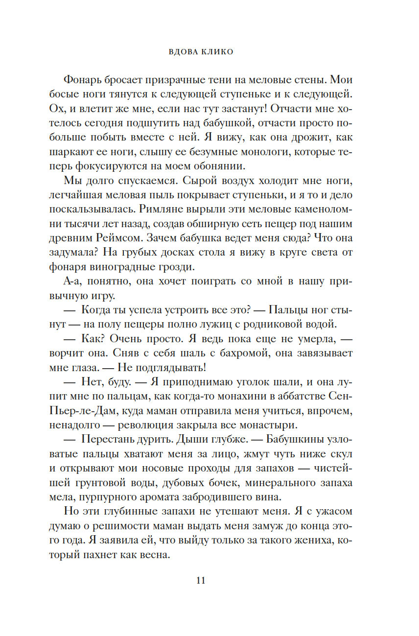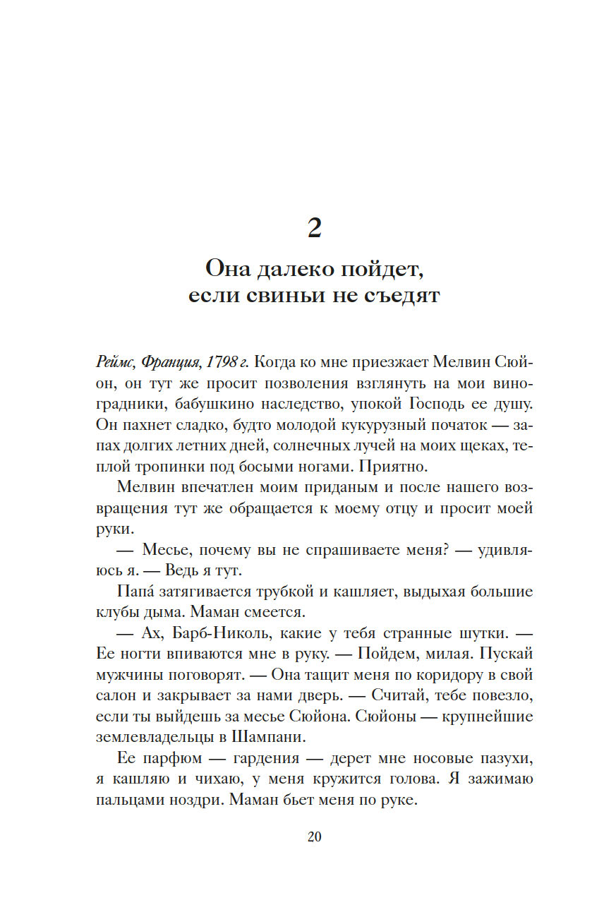 Впечатляющая сага о первой из "Вдов шампанского" Франции, Барб-Николь Клико. Обладая редким даром, известным как "Le Nez" (Нос), Барб-Николь способна создавать невероятные купажи, а также обонять "вонь лжи или благоухание чистого сердца. Или разрывающий сердце запах несбывшейся надежды". Кроме этого дара она обладает смелостью и верой в себя; преодолевает немыслимые трудности в годы действия кодекса Наполеона, который оставлял вдов без прав на собственность – а в случае Барб-Николь без ее винодельни, без ее шампанского. Сюжет, искусно переплетенный с историческими письмами Наполеона, переносит читателя в разгар турбулентной французской жизни начала XIX века, когда Барб-Николь Клико-Понсарден, создала свою империю – великую империю шампанского.