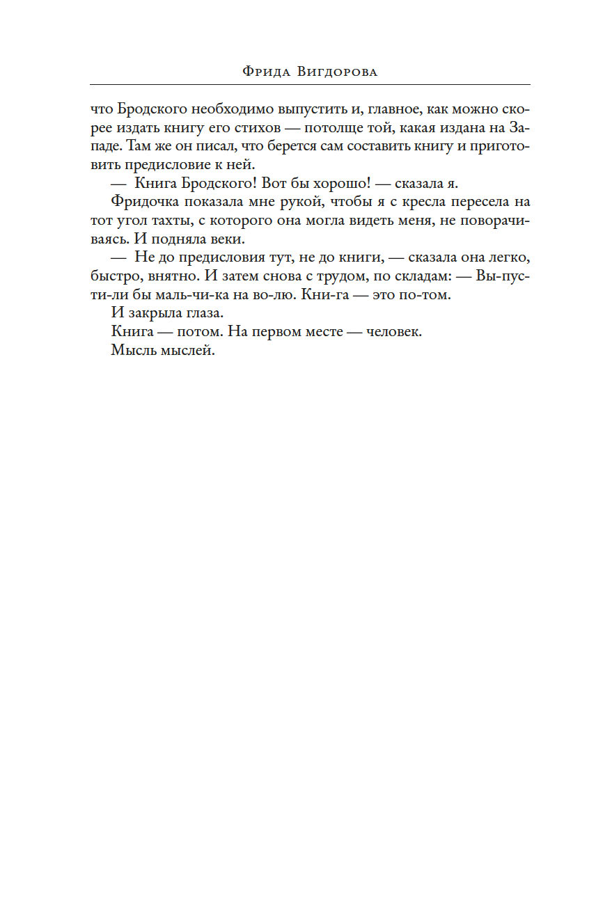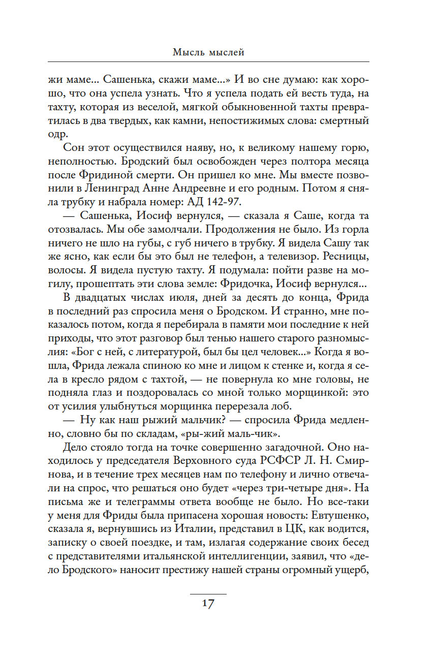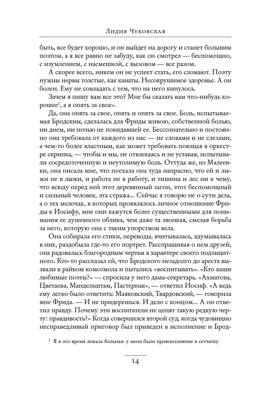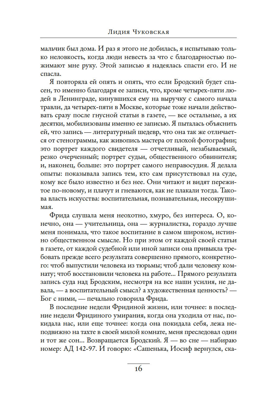 Но она защищала не только Бродского. Деревенские старики, которым председатель не давал соломы поправить прохудившуюся крышу. Беспомощные обитатели инвалидного дома. Подросток с тяжелой судьбой, сбившийся с пути, попавший в колонию... Не перечесть всех, кого она выручала, за кого заступалась, поддерживала, о чьей судьбе писала в газетах, ради кого ходила по инстанциям и боролась, отвоевывая у бездушной чиновничьей машины то, что полагалось человеку по праву.