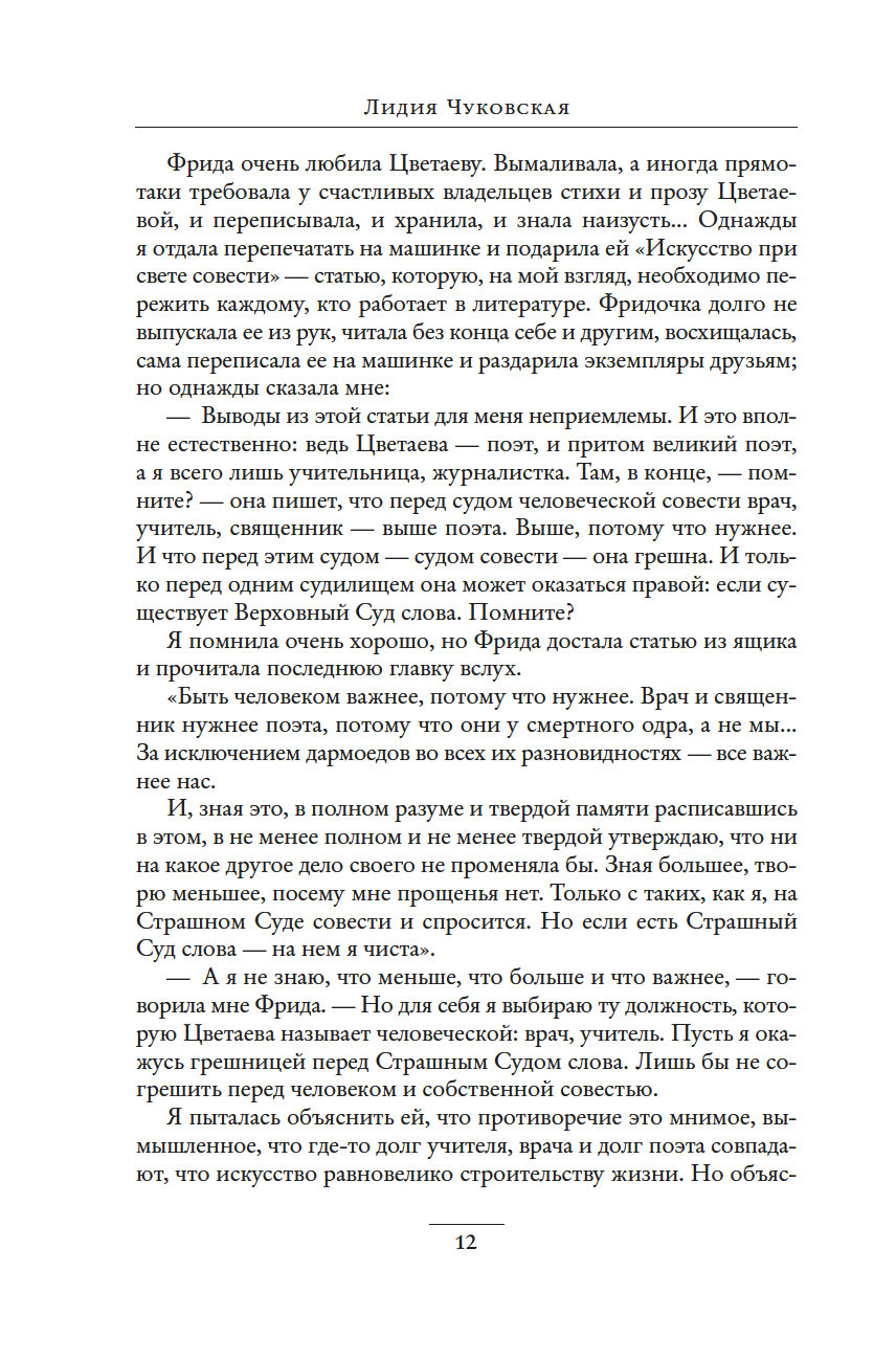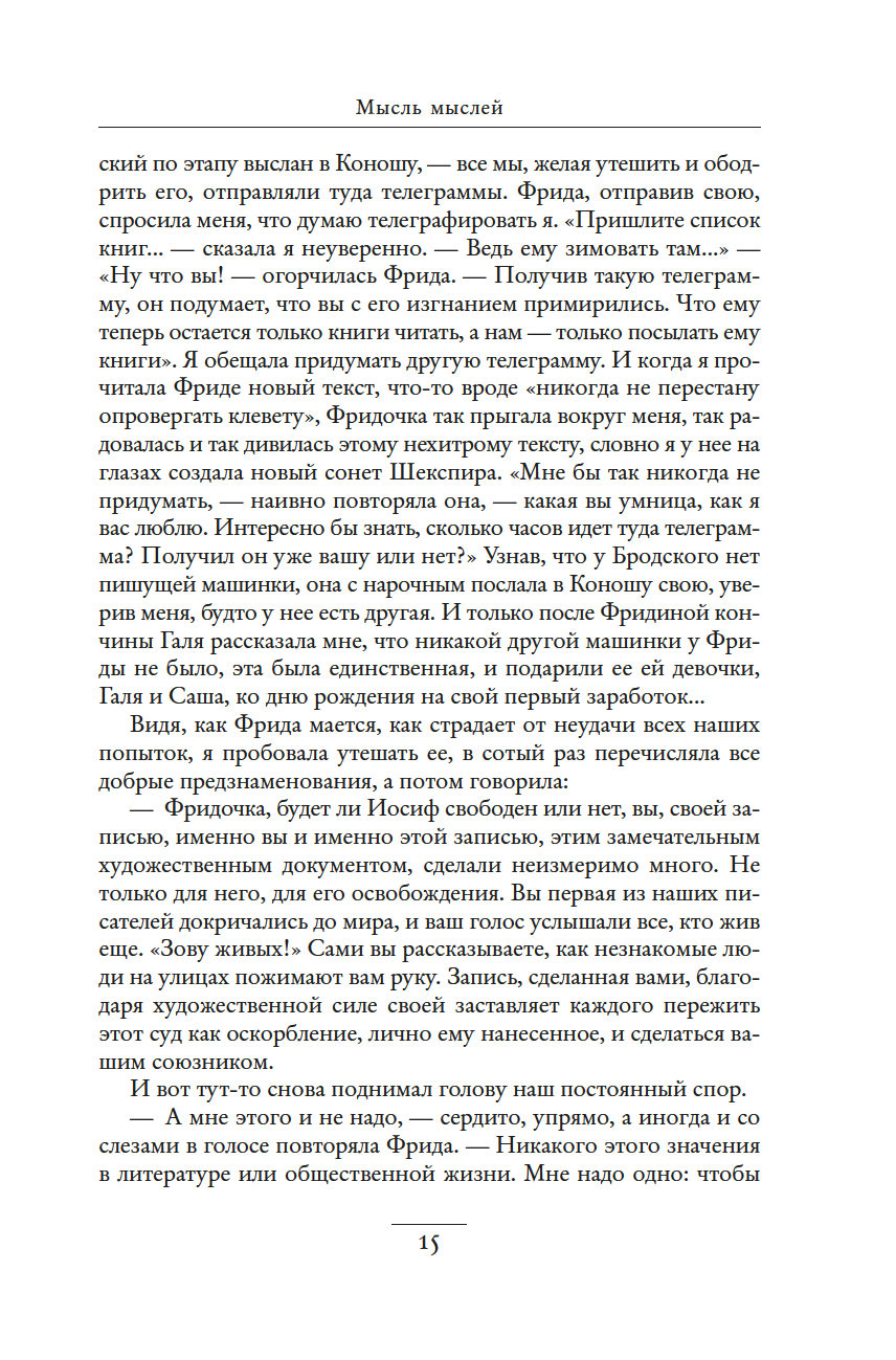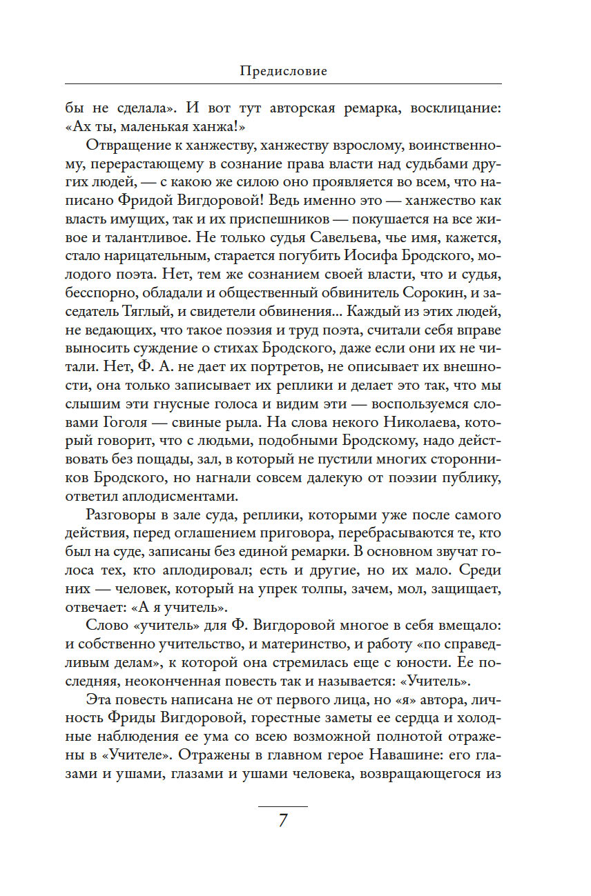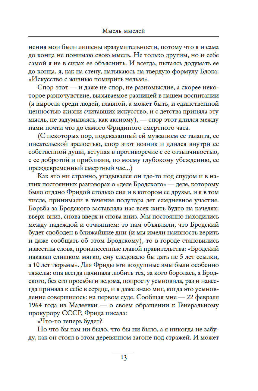 Но она защищала не только Бродского. Деревенские старики, которым председатель не давал соломы поправить прохудившуюся крышу. Беспомощные обитатели инвалидного дома. Подросток с тяжелой судьбой, сбившийся с пути, попавший в колонию... Не перечесть всех, кого она выручала, за кого заступалась, поддерживала, о чьей судьбе писала в газетах, ради кого ходила по инстанциям и боролась, отвоевывая у бездушной чиновничьей машины то, что полагалось человеку по праву.