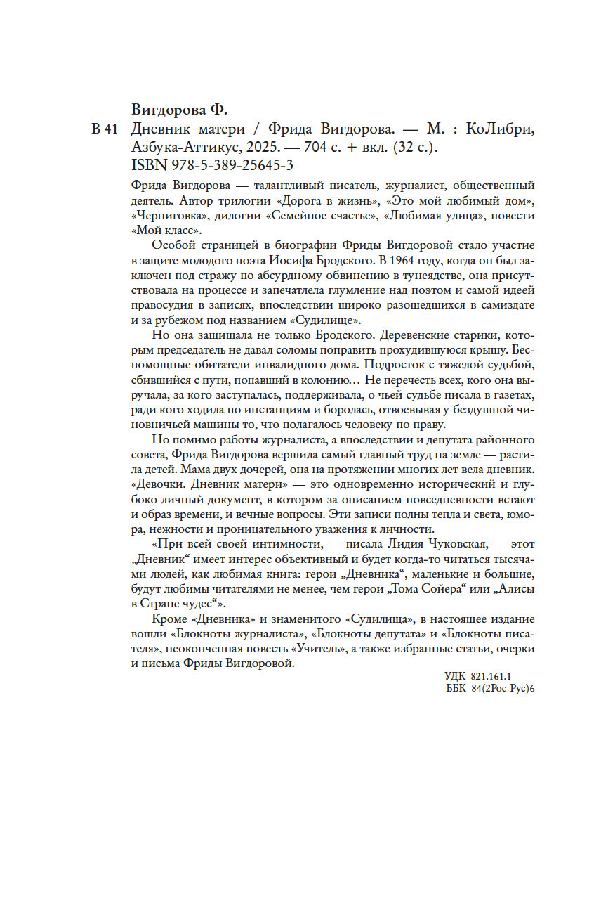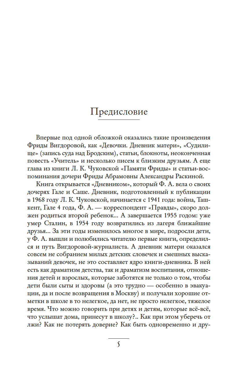 Но помимо работы журналиста, а впоследствии и депутата районного совета, Фрида Вигдорова вершила самый главный труд на земле – растила детей. Мама двух дочерей, она на протяжении многих лет вела дневник. "Девочки. Дневник матери" – это одновременно исторический и глубоко личный документ, в котором за описанием повседневности встают и образ времени, и вечные вопросы. Эти записи полны тепла и света, юмора, нежности и проницательного уважения к личности.