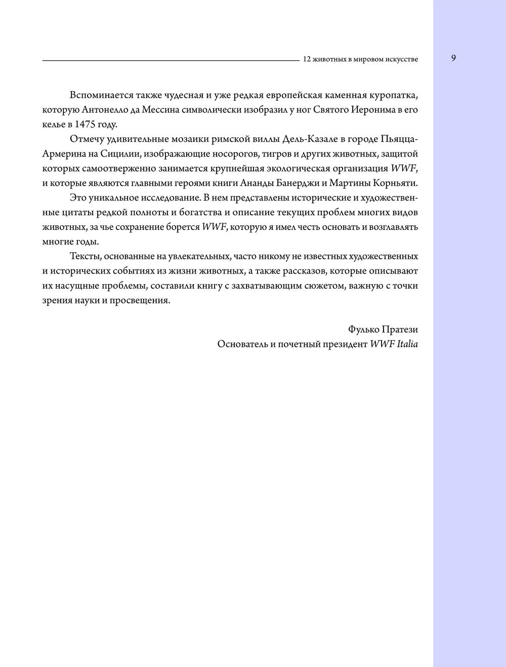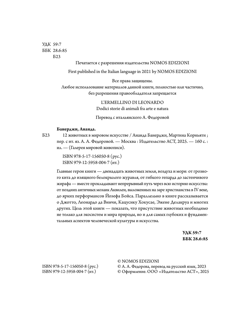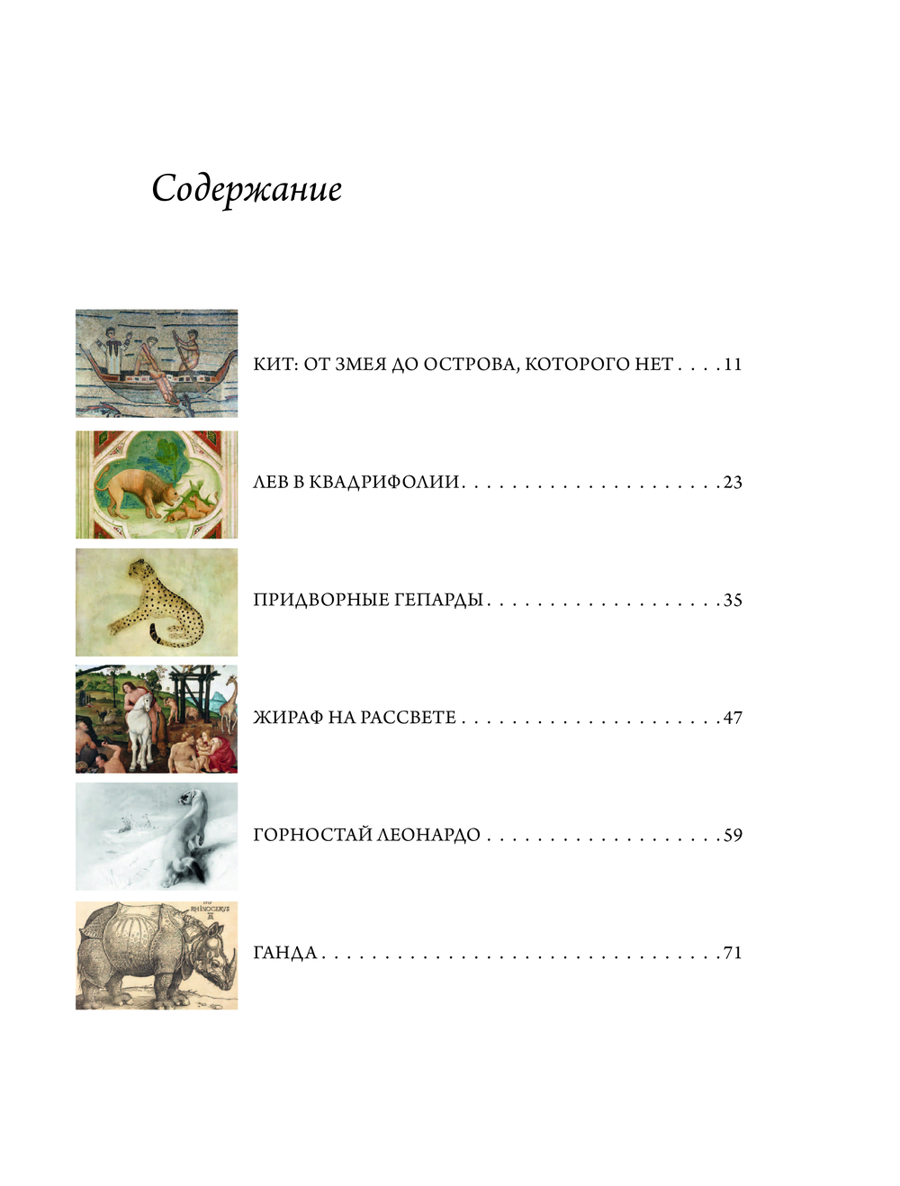 Главные герои книги – двенадцать животных земли, воздуха и моря: от грозного кита до изящного белокрылого журавля, от гибкого гепарда до застенчивого жирафа – вместе прокладывают непрерывный путь через всю историю искусства: от поздних античных мозаик Аквилеи, выложенных на заре христианства в IV веке, до ярких перформансов Йозефа Бойса. Параллельно в книге рассказывается о Джотто, Леонардо да Винчи, Кацусику Хокусае, Эжене Делакруа и многих других. Цель этой книги – показать, что присутствие животных необходимо не только для экосистем и мира природы, но и для самых глубоких и фундаментальных аспектов человеческой культуры и искусства.