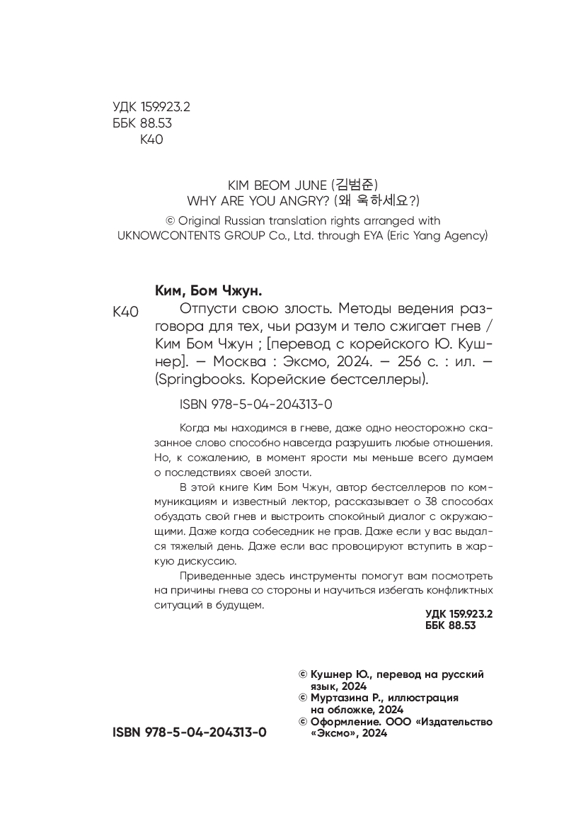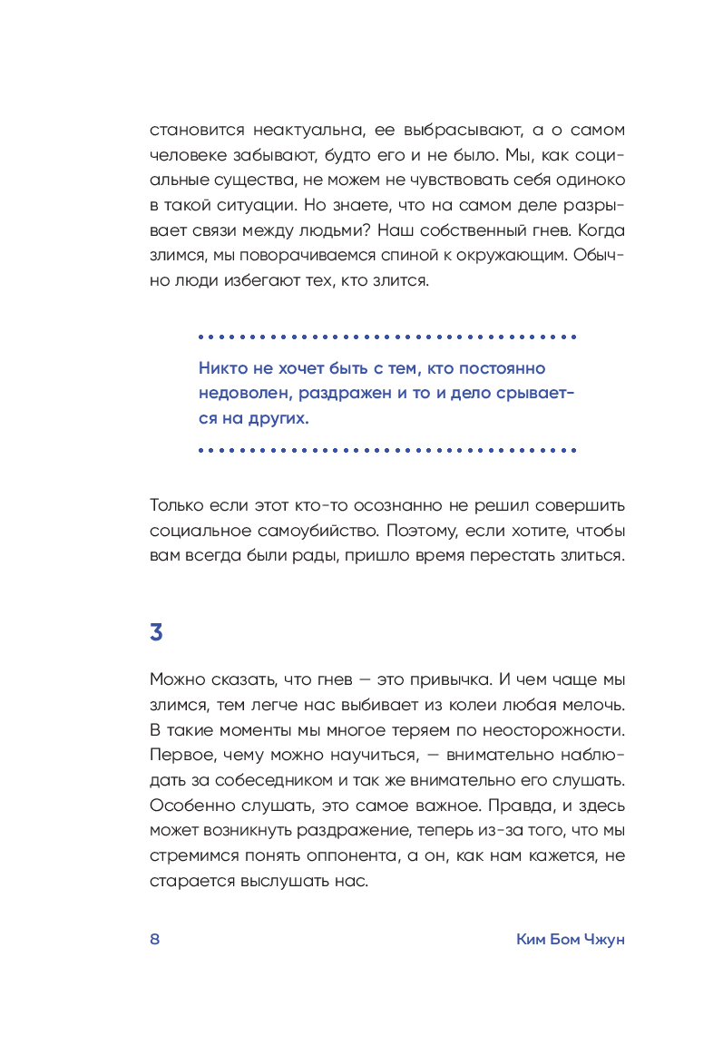 В этой книге Ким Бом Чжун, автор бестселлеров по коммуникациям и известный лектор, рассказывает о 38 способах обуздать свой гнев и выстроить спокойный диалог с окружающими. Даже когда собеседник не прав. Даже если у вас выдался тяжелый день. Даже если вас провоцируют вступить в жаркую дискуссию.