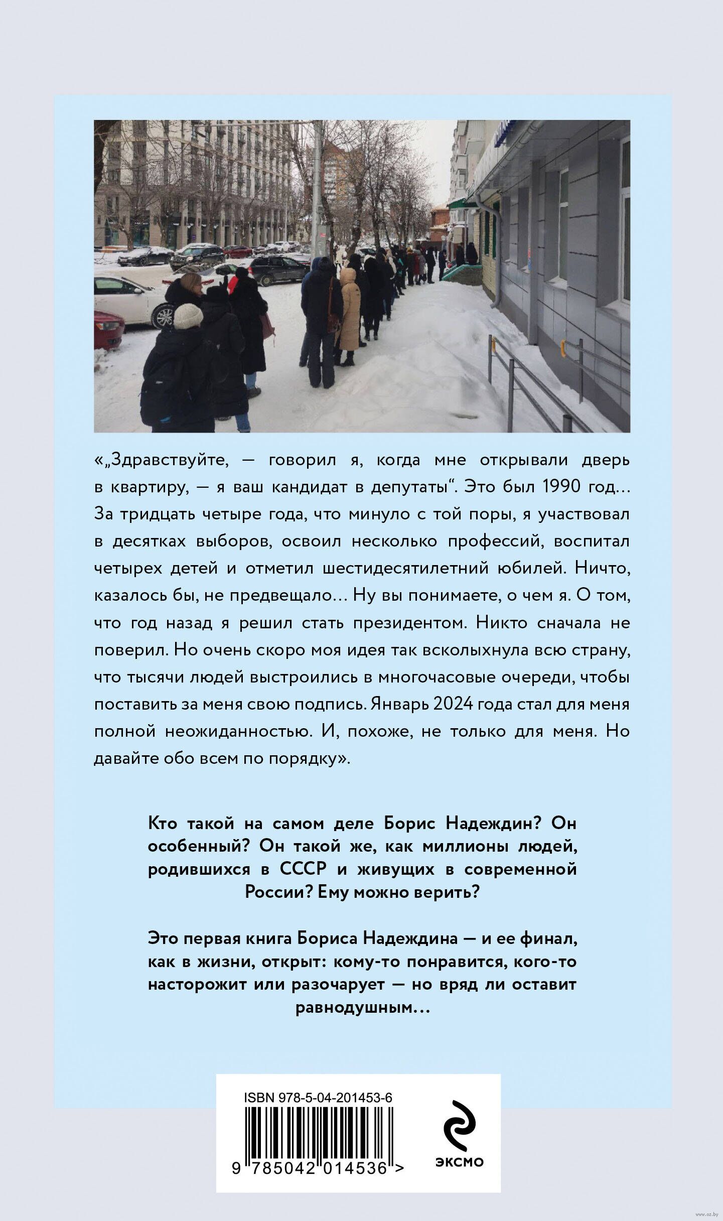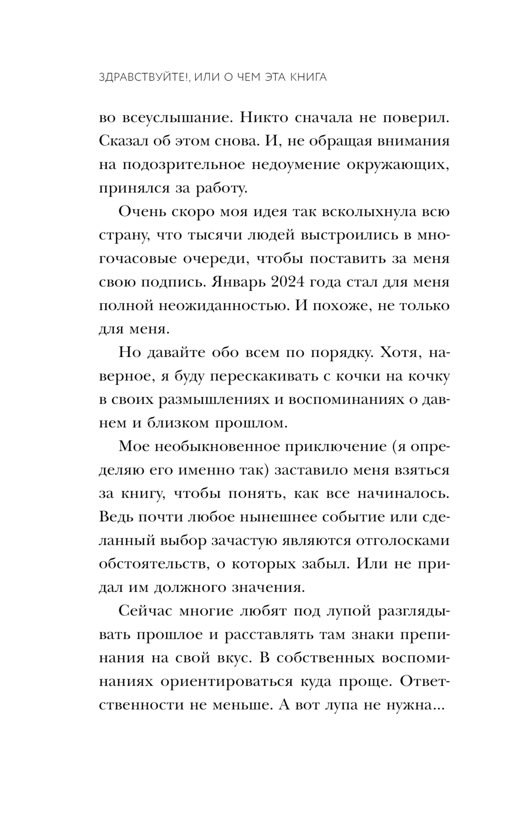 ""Здравствуйте, – говорил я, когда мне открывали дверь в квартиру, – я ваш кандидат в депутаты". Это был 1990 год... За тридцать четыре года, что минуло с той поры, я участвовал в десятках выборов, освоил несколько профессий, воспитал четырех детей и отметил шестидесятилетний юбилей. Ничто, казалось бы, не предвещало... Ну вы понимаете, о чем я. О том, что год назад я решил стать президентом. Никто сначала не поверил. Очень скоро моя идея так всколыхнула всю страну, что тысячи людей выстроились в многочасовые очереди, чтобы поставить за меня свою подпись. Январь 2024 года стал для меня полной неожиданностью. И похоже, не только для меня. Но давайте обо всем по порядку".