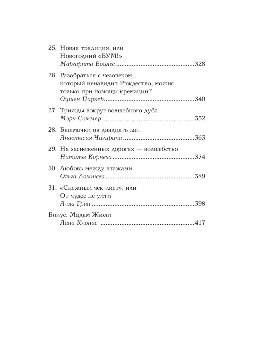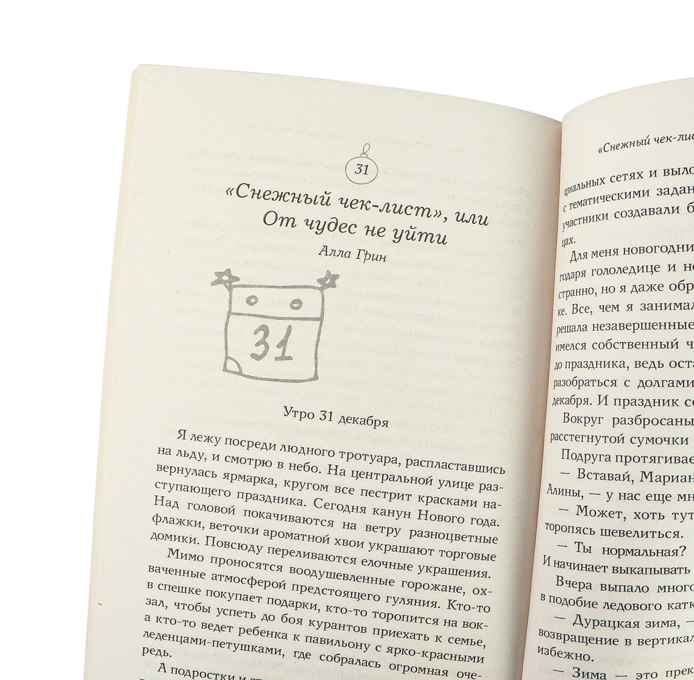 Книгу получила в подарок на новый год, поэтому читала в январе. Объективно из всей книги мне понравилось +- 10 историй. Может быть если читать в декабре истории покажутся более интересными. Те, кто не любит фэнтези не берите, мне кажется их здесь больше. Прилагаю перечень историй: Книга Адвент: 1 история про сына Санту и обычную девочку, которые познакомились в рождество. 2 про девушку которая попала в сказку, стала красной шапочкой и познакомилась с волком. 3 про парня и девушку которые знакомятся в кофейне в Париже в снегопад. 4 про девушку и парня, которые познакомились в компьютерной игре. 5 про школьницу изгоя и популярного парня. 6 про русскую девушку живущую в Испании, которая хотела встретиться новый год с семьёй на родине . 7 про девушку, её антиновогоднее кафе и не любовь к празднику. 8 про девушку, которая спасла в новогоднюю ночь в лесу в метель охотника. 9 про двух коллег, которые слегка друг друга не переваривают, которым дали задание вместе организовать новогодний праздник. 10 История про лучших друзей, которые решили пожениться, если до 30 не найдут свою любовь. 11 история про фонарщика и левитирующую девушку. 12 про двух эльфов, которые должны были использовать одно рождественское чудо и для этого выбрали пару влюбленных людей. 13 про двух сестер застрявших на колесе обозрения с незнакомым парнем на рождество. 14 друг или роман по переписке 15 про девушку и парня решивших отметить новый год в кофейне и про 12 новогодних традиций (очень милая история) 16 про фигуриста и неуверенную в себе фигуристку 17 про желание почувствовать дух праздника в эмиграции 18 философская история о зимнем духе по имени "Ветерок" 19 про парня, который вечно задирал девчонку, а потом неожиданно, для нее, помог ей 20 история про беременную девушка, которая поехала в глубокую деревню к семье своего парня, чтобы пройти какой-то "ритуал" (тут вообще не про праздник) 21 о девочке, которая поднимаясь на святую гору встретила духа 22 история глазами котенка 23 корейская история про официантку и постоянного клиента кафе, где она работала 24 корейская сказка тут и: наследница небес, мрачные жницы, кумихо 25 про смертную девушку и демонов загробного мира, которые устроили ради нее Новый год 26 про девушку, которая обожает рождество и парня, который его ненавидит и про чудо (приятная история) 27 парень таксист, спящая пассажирка, дед мороз и магическая новогодняя ночь 28 история про девушку, которая работает в зоомагазине и при этом боится собак и покупателя у которого 5 собак, борьба со страхами и все такое 29 девушка уезжает на праздники в китайскую глубинку и по пути застревает в машине и тут встречает парня 30 два незнакомца застряли в лифте за час до нового года 31 девушка, которая была не настроена на праздник из-за учебы и парень, который исполнял новогодний чек лист 32/бонус Истрия про девушку, которая пошла ведьме, чтобы та сделала ее богатой и знаменитой.