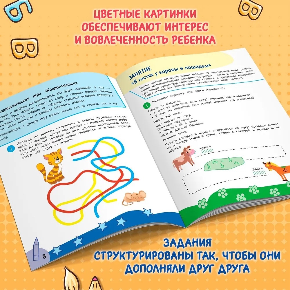 Пособие состоит из занятий, каждое из которых включает 3 задания и нейродинамическую игру. Задания дополняют друг друга, что обеспечивает комплексный подход в развитии и обучении малыша. Выбранный метод позволяет активизировать все познавательные процессы, речедвигательную деятельность ребёнка, а также сформировать у малыша полезную и важную привычку к целенаправленному обучению.