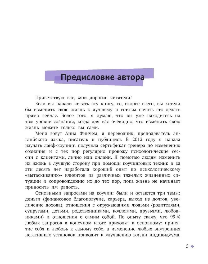 Книга написана на основании многолетнего опыта работы автора с клиентами по основным запросам (деньги, отношения, принятие себя). Посвящена людям, которые понимают, что хотят изменить свою жизнь к лучшему, но не знают, с чего начать, и пока не готовы обратиться к специалисту. В книге содержатся практические рекомендации, рабочие техники, коучинговые приемы, которые может применить каждый человек, попавший в тяжелую психологическую ситуацию. Описанные случаи взяты из практики психологических сессий с разрешения клиентов. То, что помогло им, может помочь и вам. Создайте свою счастливую жизнь сами!