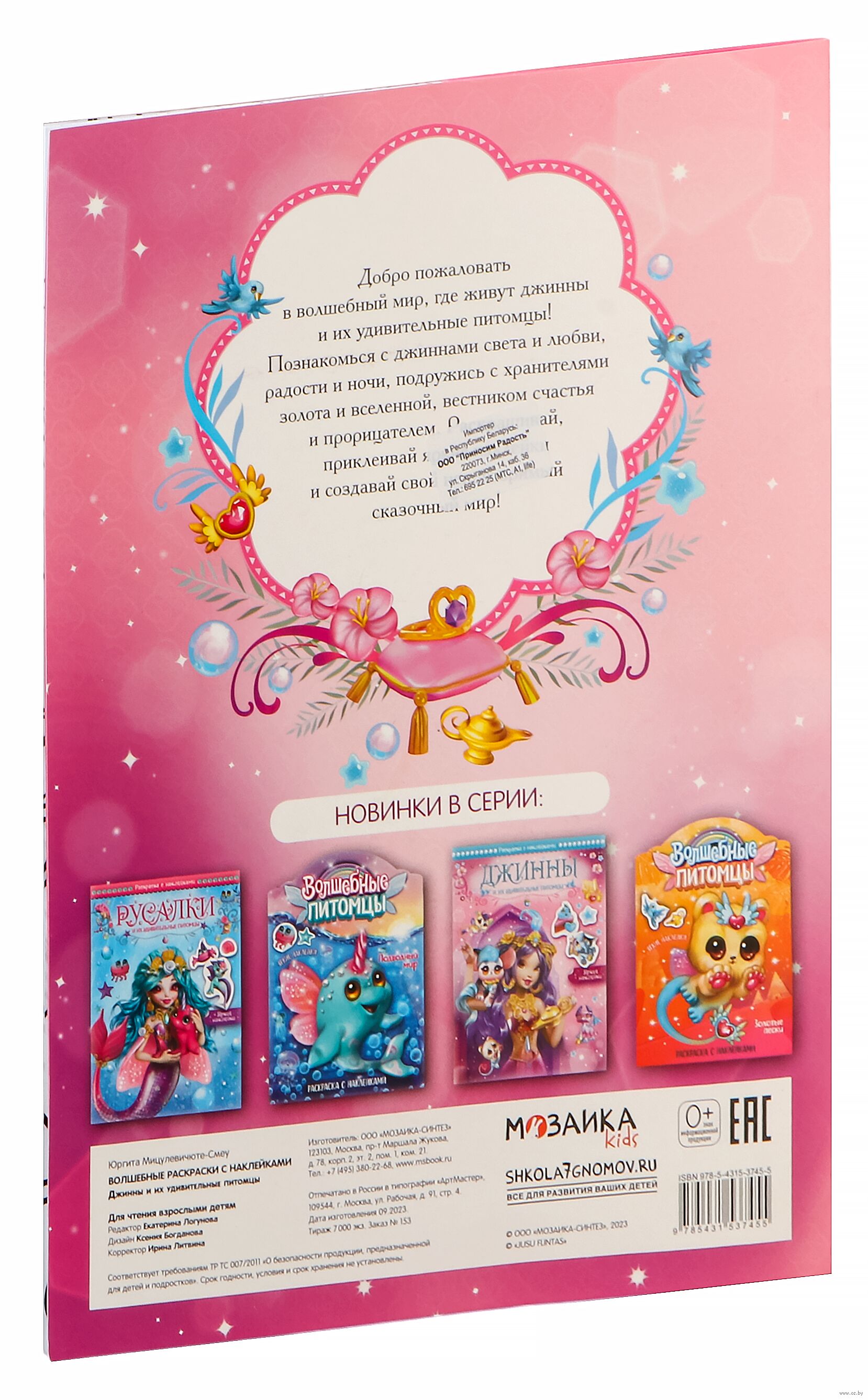 В книге "Джинны и их удивительные питомцы" серии "Волшебные раскраски с наклейками" ребенок будет увлеченно раскрашивать новых героев, включая фантазию и воображение, и приклеивать яркие наклейки на страницы книги, делая сказочный мир уютнее и наряднее. За такими занятиями ребенок проведет время не только интересно, но и с пользой: развивая мелкую моторику, внимание и воображение.