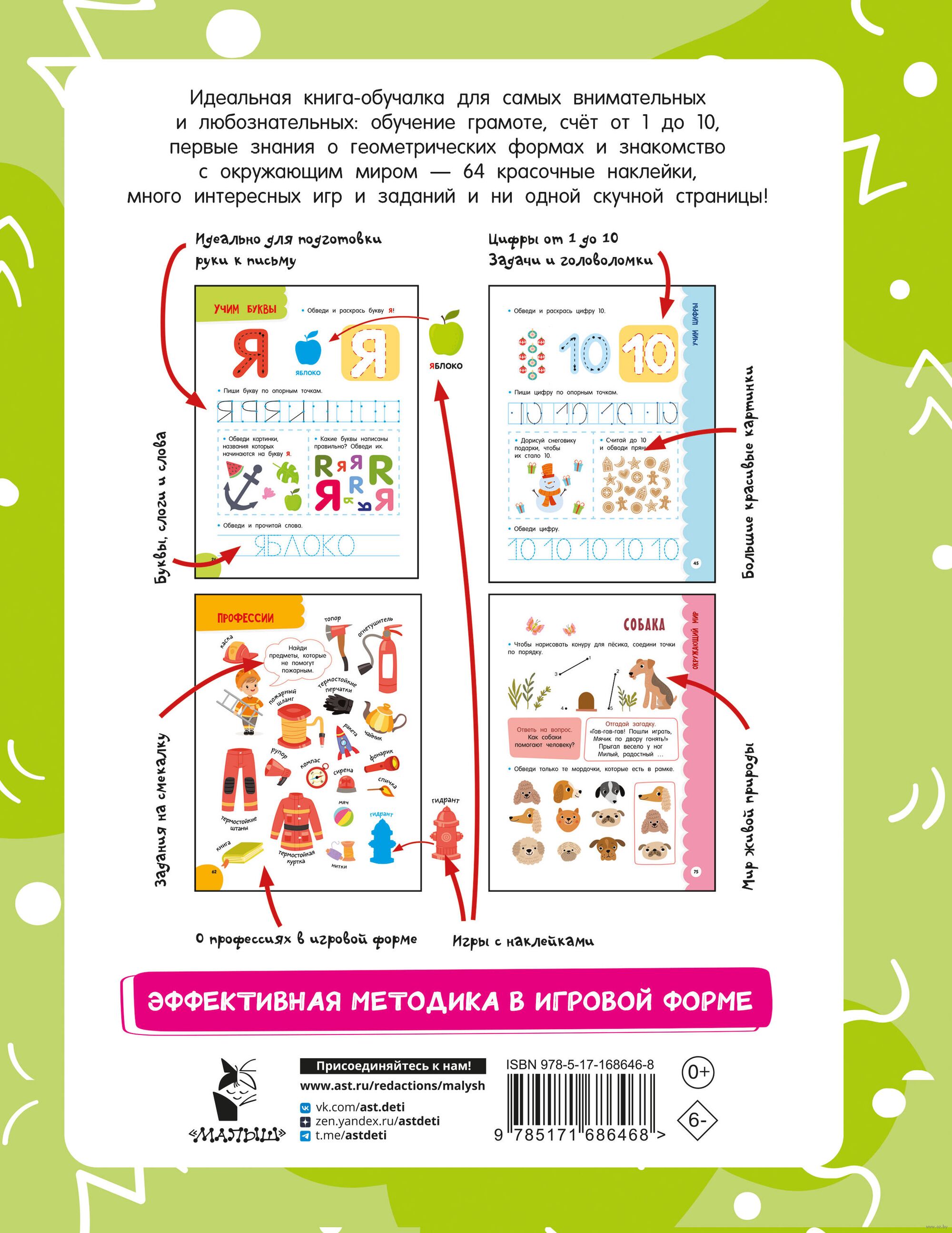 Это идеальная книга-обучалка для самых внимательных и любознательных: 64 красочные наклейки, много интересных игр и заданий, цветные картинки – и ни одной скучной страницы!