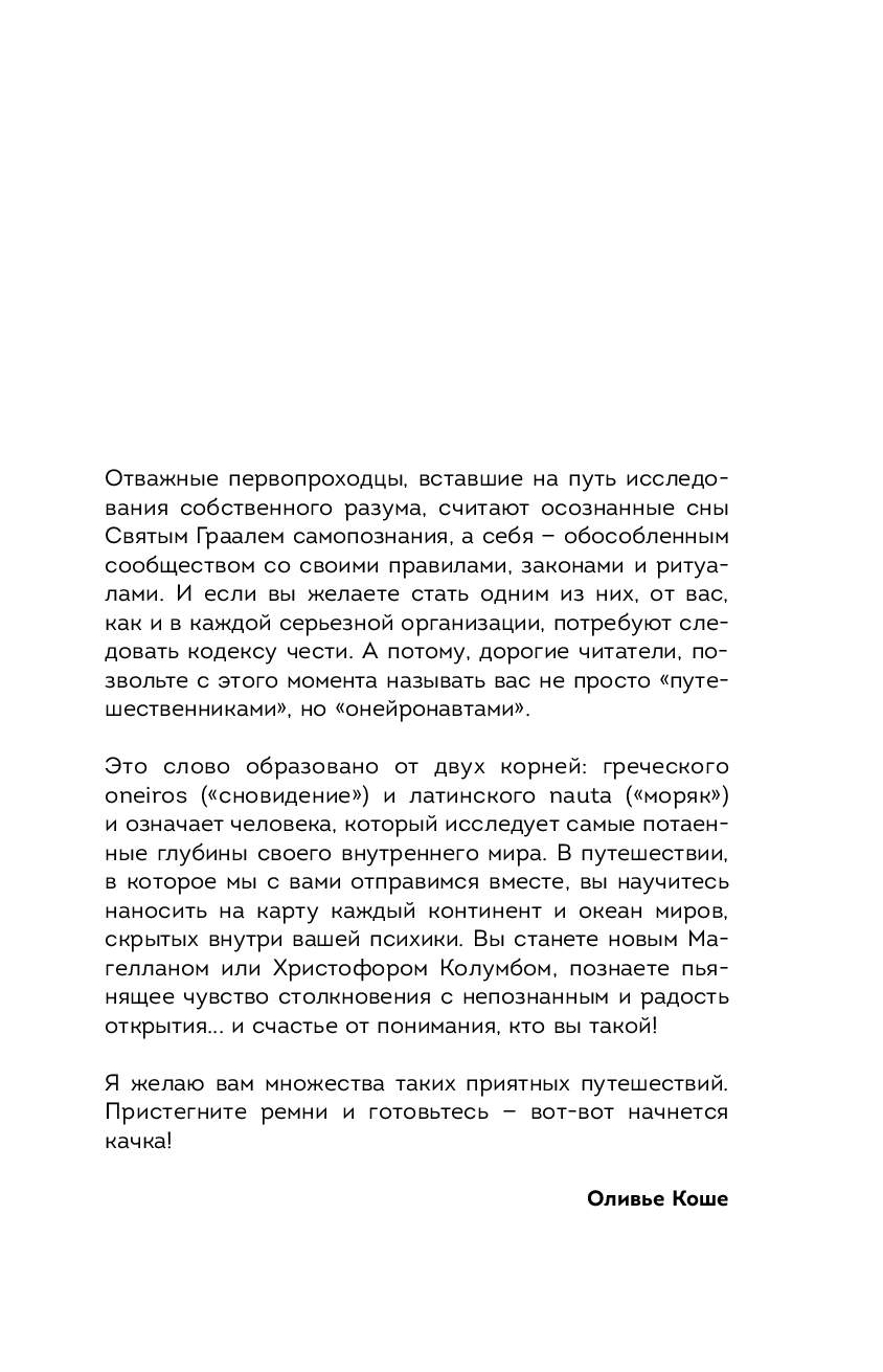 Наш мозг каждую ночь показывает нам кино! Но часто, просыпаясь, мы ничего не помним. Сны исчезают, а с ними – уплывает от нас целый мир. Как научиться запоминать сновидения, как сделать их осознанными и полезными для жизни? Все это вы узнаете из книги Оливье Коше "Мир снов и как им осознанно управлять". Высказывания известных нейробиологов, психотерапевтов и даже математиков, упражнения, уникальные практики – эта книга поможет вам перепрограммировать себя и научиться читать и понимать информацию о себе и своей жизни через осознанные сны. Оливье Коше задает читателю простые и важные вопросы. Какими внутренними ресурсами вы обладаете, чем подпитываете свою духовную жизнь, чего боитесь?