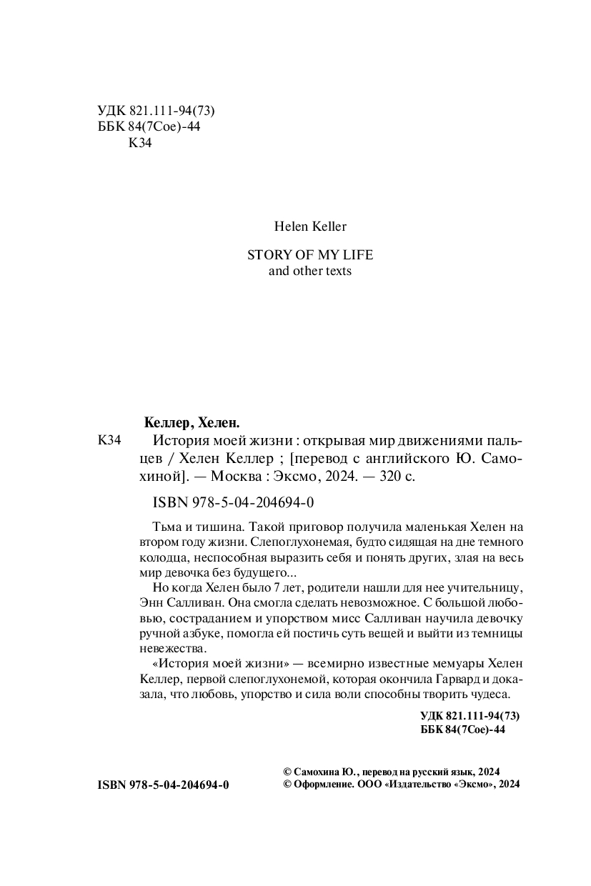 "История моей жизни" – всемирно известные мемуары Хелен Келлер, первой слепоглухонемой, которая окончила Гарвард и доказала, что любовь, упорство и сила воли способны творить чудеса.