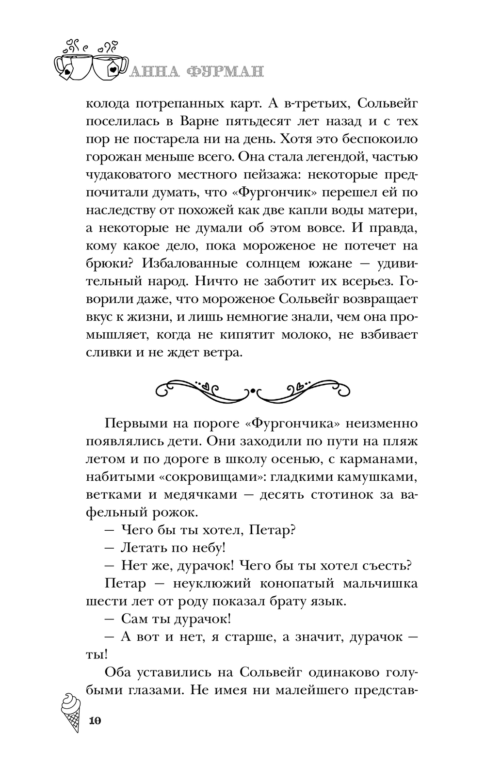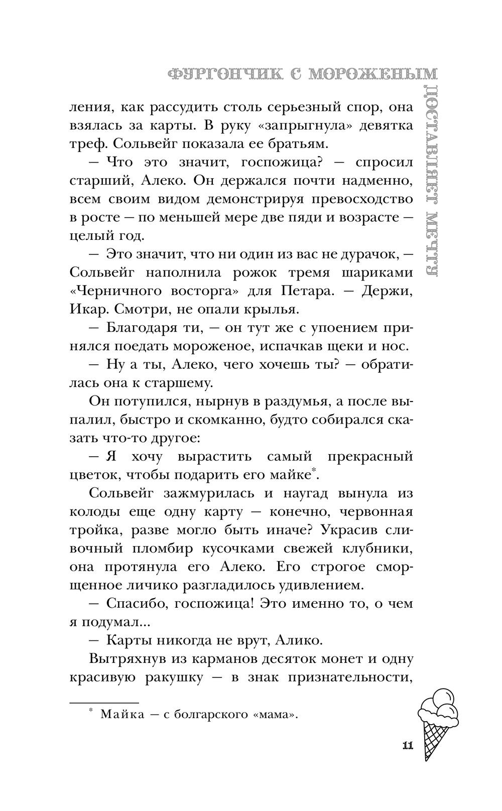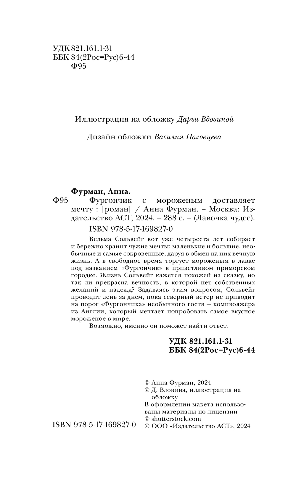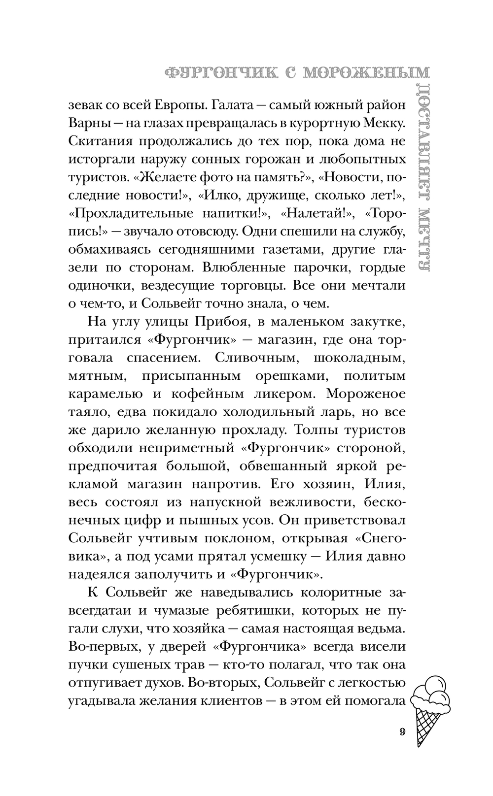 Ведьма Сольвейг вот уже четыреста лет собирает и бережно хранит чужие мечты: маленькие и большие, необычные и самые сокровенные, даруя в обмен на них вечную жизнь. А в свободное время торгует мороженым в лавке под названием "Фургончик" в приветливом приморском городке. Жизнь Сольвейг кажется похожей на сказку, но так ли прекрасна вечность, в которой нет собственных желаний и надежд? Задаваясь этим вопросом, Сольвейг проводит день за днем, пока северный ветер не приносит на порог "Фургончика" необычного гостя – коммивояжера из Англии, который мечтает попробовать самое вкусное мороженое в мире.