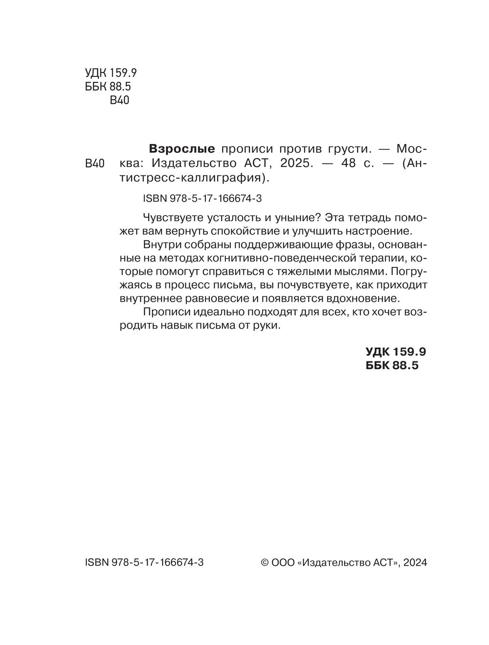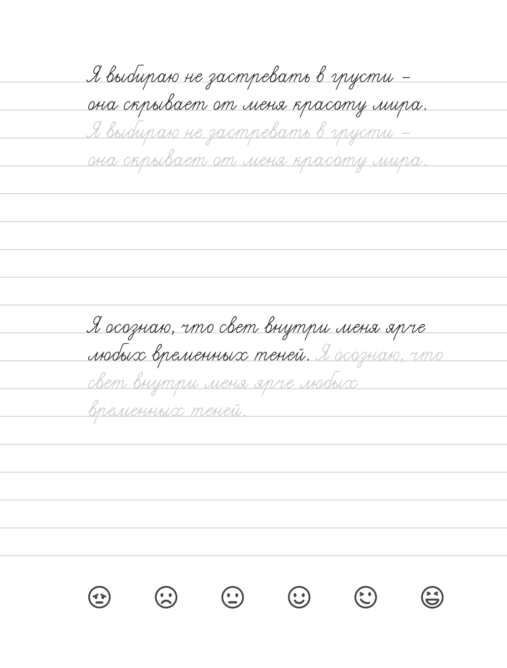 Внутри собраны поддерживающие фразы, основанные на методах когнитивно-поведенческой терапии, которые помогут справиться с тяжелыми мыслями. Погружаясь в процесс письма, вы почувствуете, как приходит внутреннее равновесие и появляется вдохновение.