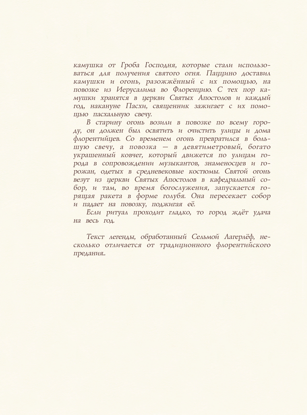 По легенде безжалостный, жестокий воин из Флоренции дошёл со своим отрядом до Иерусалима и захватил город. Но со временем богатство, признание, воинские почести потеряли для него смысл, а стало важно лишь пламя свечи из Храма Гроба Господня, которое он вёз из Иерусалима к себе во Флоренцию... Что же заставило его отречься от друзей и пиров и отправиться в этот долгий и трудный путь? Сельма Лагерлёф – знаменитая шведская писательница, первая женщина, получившая Нобелевскую премию по литературе в 1909 году.