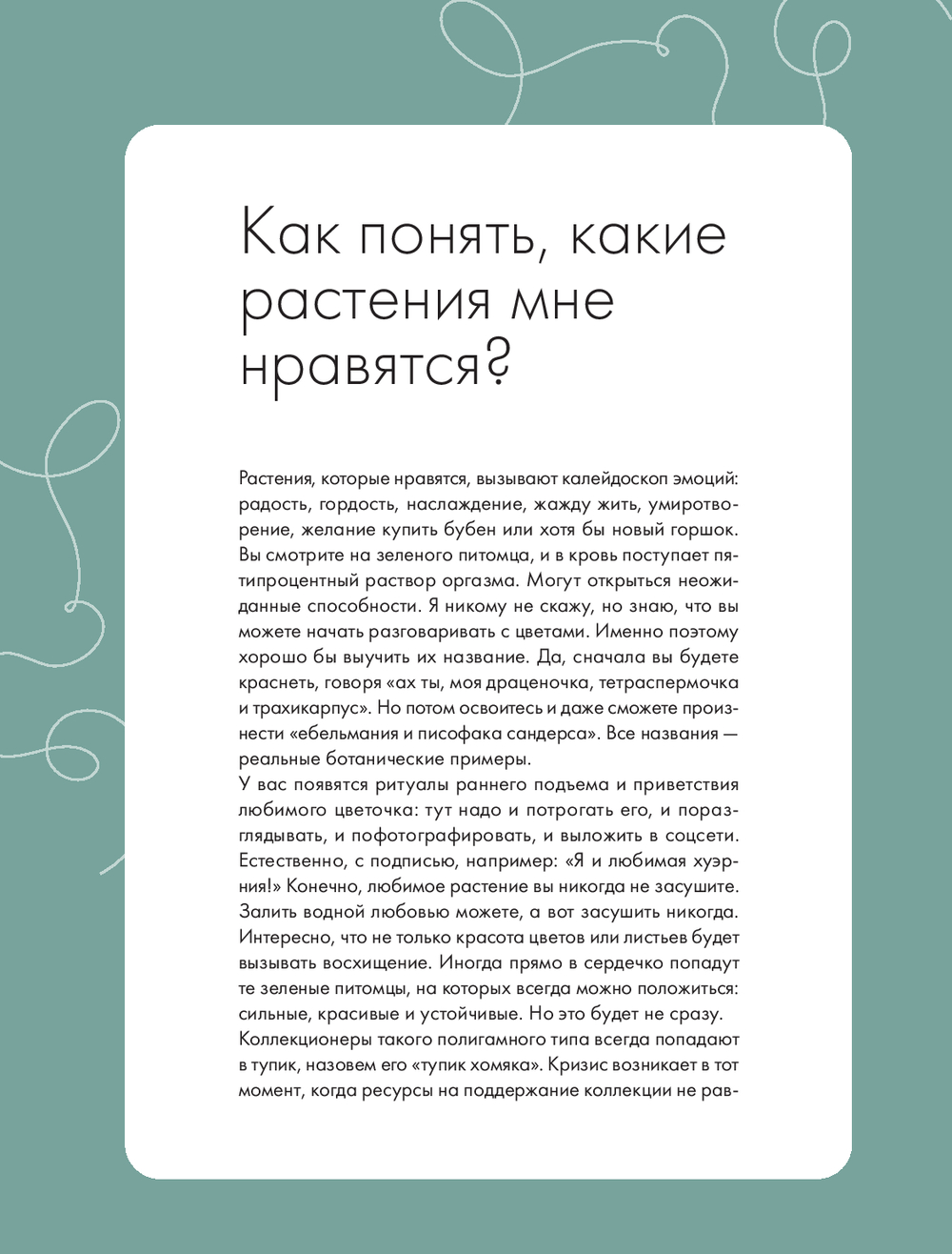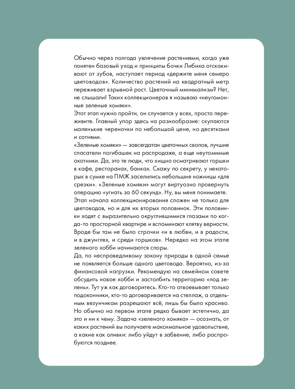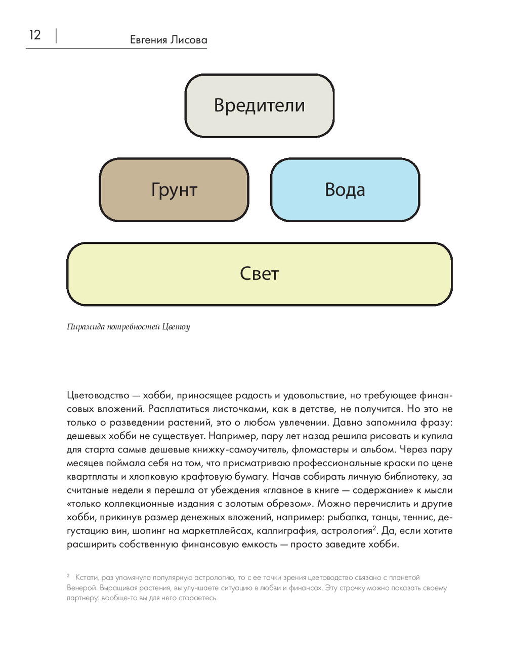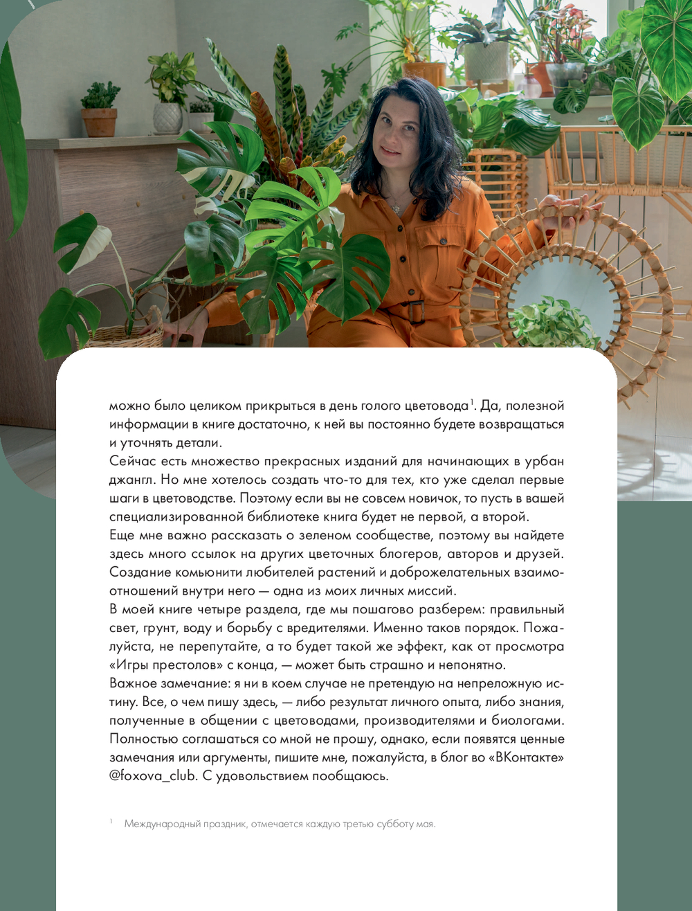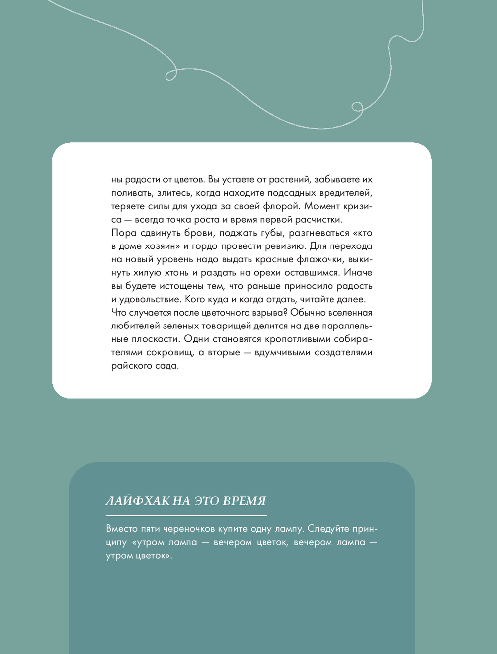 Эта книга для тех, кто уже понимает базовый уход за растениями, но в процессе все еще сталкивается с рядом трудностей и путается с многообразием нюансов для каждого цветка. Вы поймете, чего именно не хватает вашим растениям, начиная от досветки и заканчивая борьбой с вредителями. Также вы сможете определиться, к какому типу цветовода относитесь, и понять, от каких растений вам лучше бы избавиться, чтобы цветоводство приносило исключительно положительные эмоции. А секретные лайфхаки от профессионального цветовода Евгении Лисовой, написанные легким языком с долей юмора, обязательно помогут вам вырастить пышные кусты, которыми даже можно будет прикрыться в день голого цветовода!