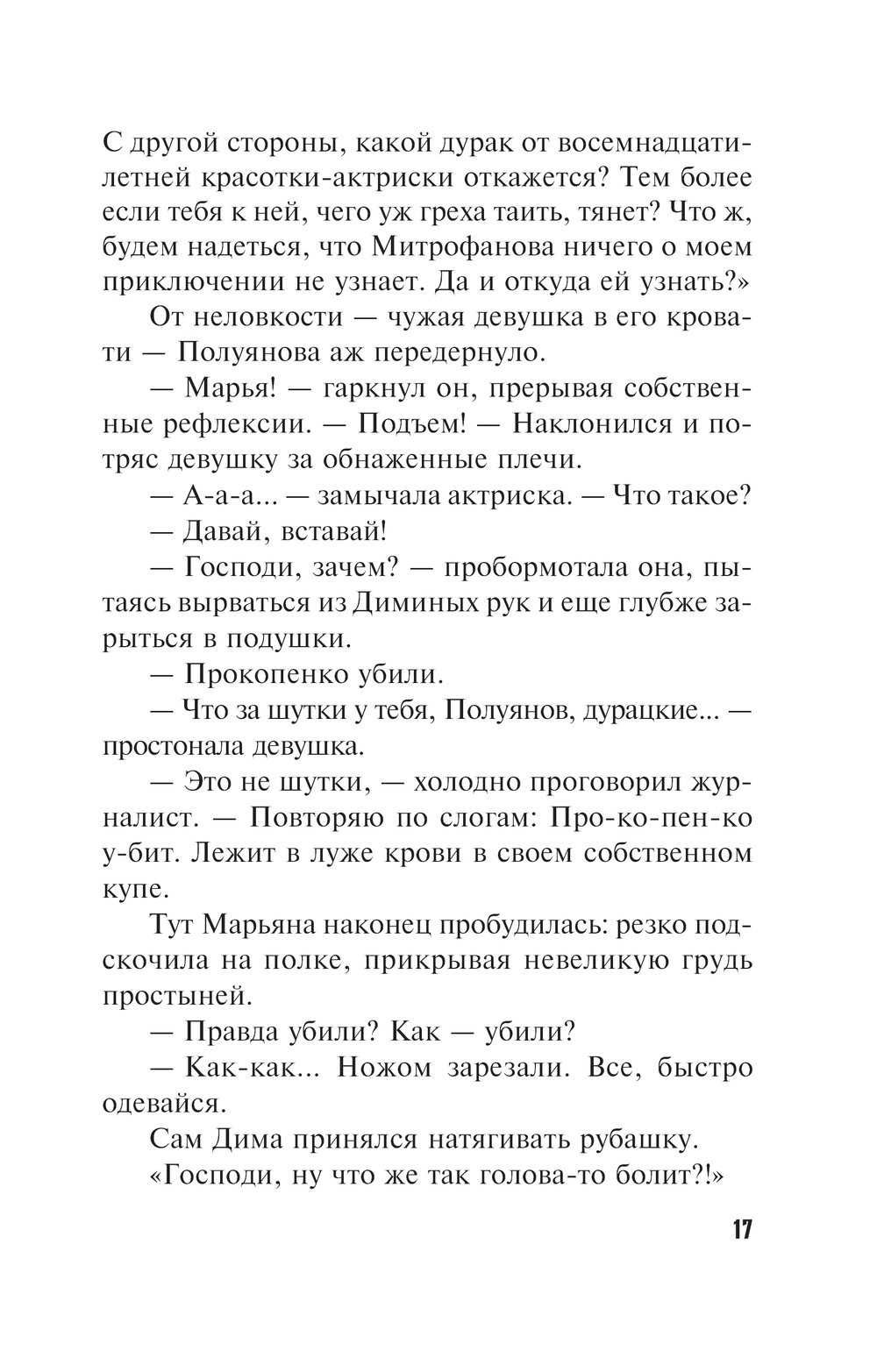 Журналиста Диму Полуянова пригласили сыграть небольшую роль в фильме по мотивам его книги. Попав в киношную среду, даже Дима, многое повидавший в силу профессии, был удивлен свободой нравов и кипением страстей как на съемочной площадке, так и за ее пределами. Маститый режиссер Прокопенко крутил роман с исполнительницей главной роли Ольгой Волочковской, но в его номер захаживали и другие актрисы. А колоритный актер Никола Кряжин отчаянно ревновал Ольгу, легко променявшую его на более выгодную партию... Убийство режиссера прямо в купе поезда, которым они возвращались со съемок в Питере, стало для всей группы настоящим шоком. Ведь убийца – один из них...