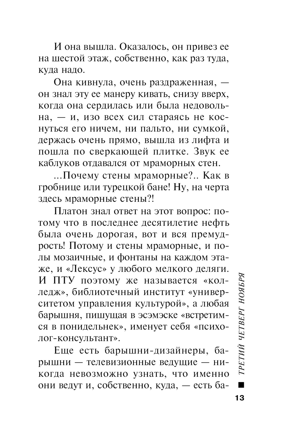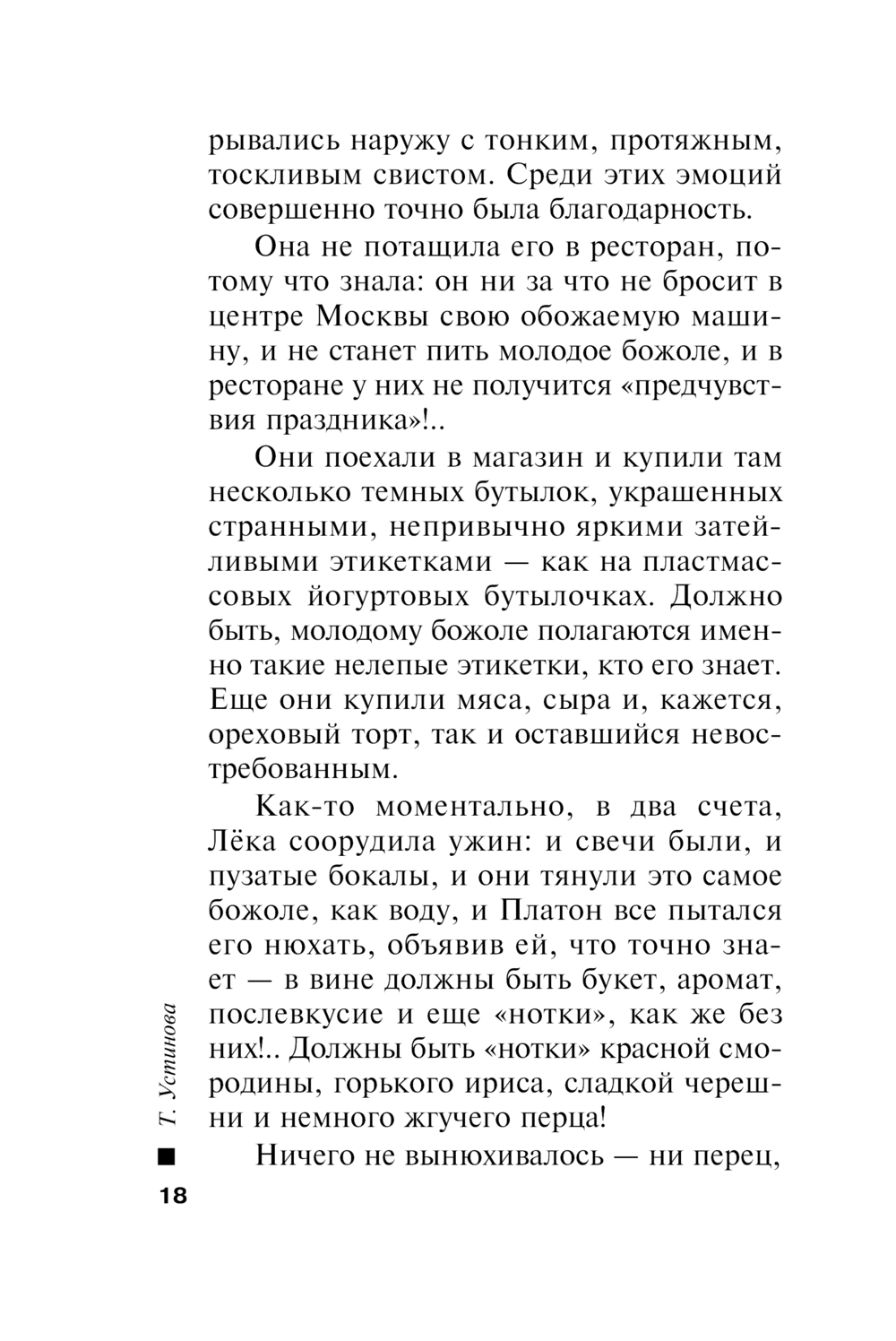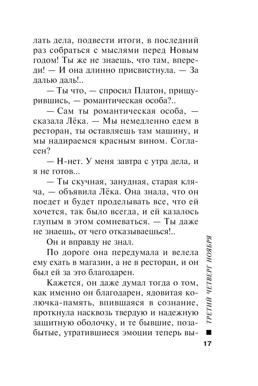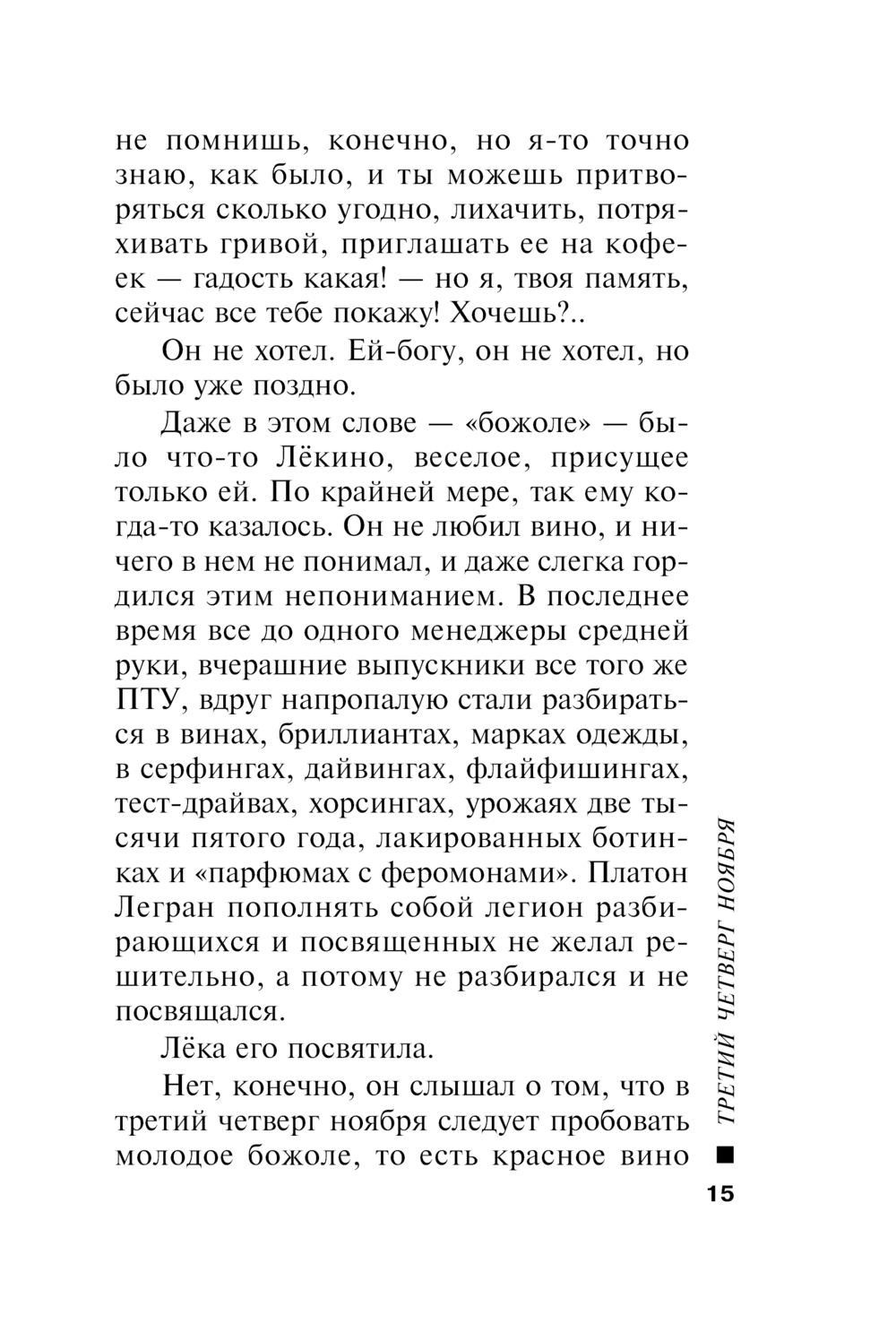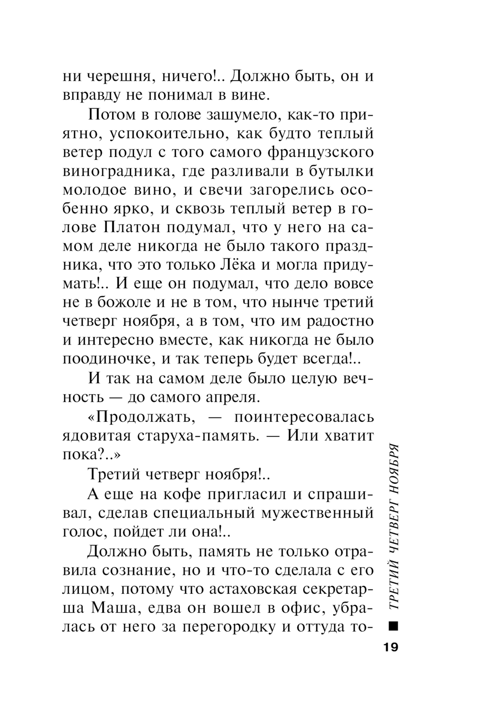 Потом в голове зашумело, как-то приятно, успокоительно, как будто теплый ветер подул с того самого французского виноградника, где разливали в бутылки молодое вино, и свечи загорелись особенно ярко, и сквозь теплый ветер в голове Платон подумал, что у него на самом деле никогда не было такого праздника, что это только Лёка и могла придумать!.. И еще он подумал, что дело вовсе не в божоле и не в том, что нынче третий четверг ноября, а в том, что им радостно и интересно вместе, как никогда не было поодиночке, и так теперь будет всегда!..