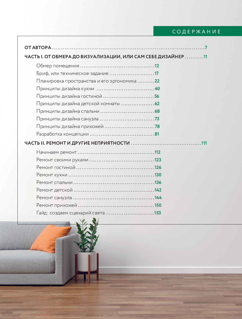 Мечтая о стильном дизайне своего дома, грамотной эргономике и организации пространства, необязательно изучать миллион ресурсов в Интернете и учиться на специальных курсах. В этой книге собрана только важная и нужная базовая информация, которая станет удобной шпаргалкой для всех, кто хочет создать дизайн-проект самостоятельно. В ней представлены все этапы выполнения проекта с четкими пошаговыми рекомендациями, а также советы по планировке, зонированию, описание популярных стилей и полезные чек-листы, облегчающие создание проекта. Во второй части описывается процесс выполнения ремонта для понимания последовательности действий, и возможности оценить текущий этап и масштаб работы. Также вы найдете рекомендации по расчету бюджета, чтобы ремонт оставался под вашим контролем и не превратился в бесконечный процесс.