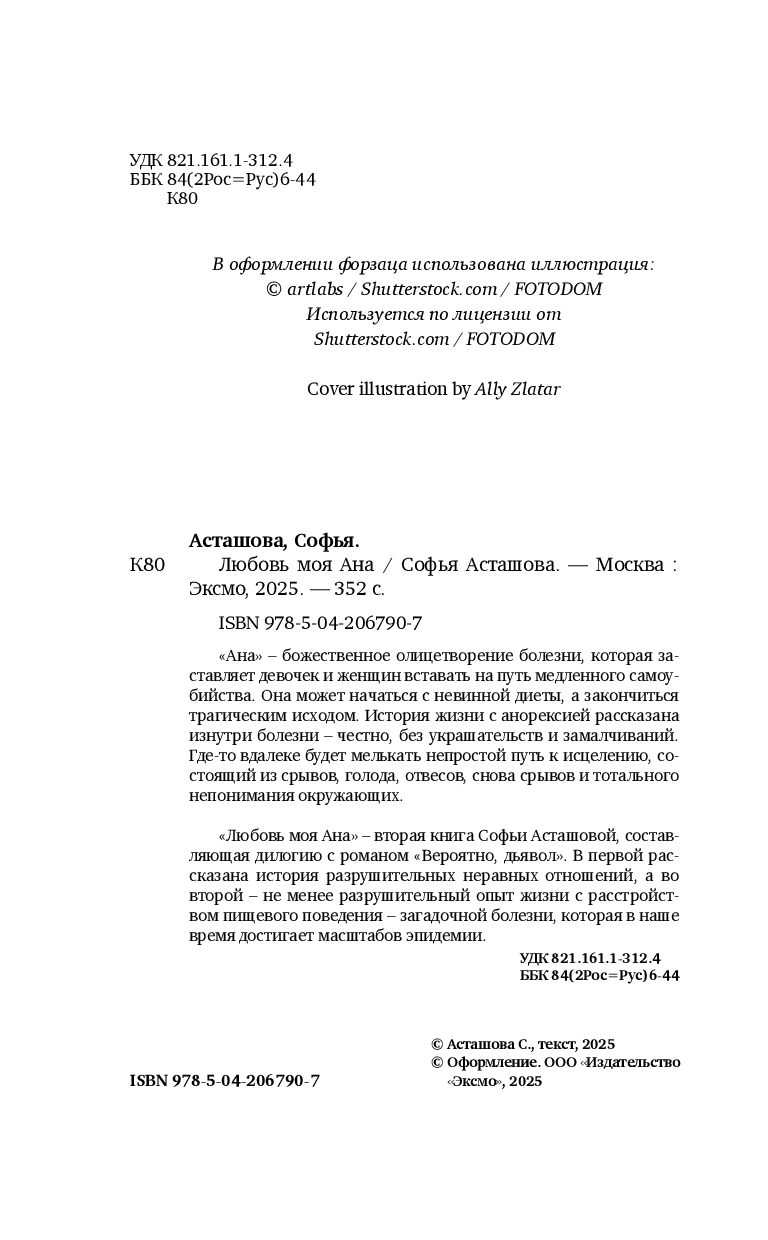"Любовь моя Ана" – вторая книга Софьи Асташовой, составляющая дилогию с романом "Вероятно, дьявол". В первой рассказана история разрушительных неравных отношений, а во второй – не менее разрушительный опыт жизни с расстройством пищевого поведения – загадочной болезни, которая в наше время достигает масштабов эпидемии.