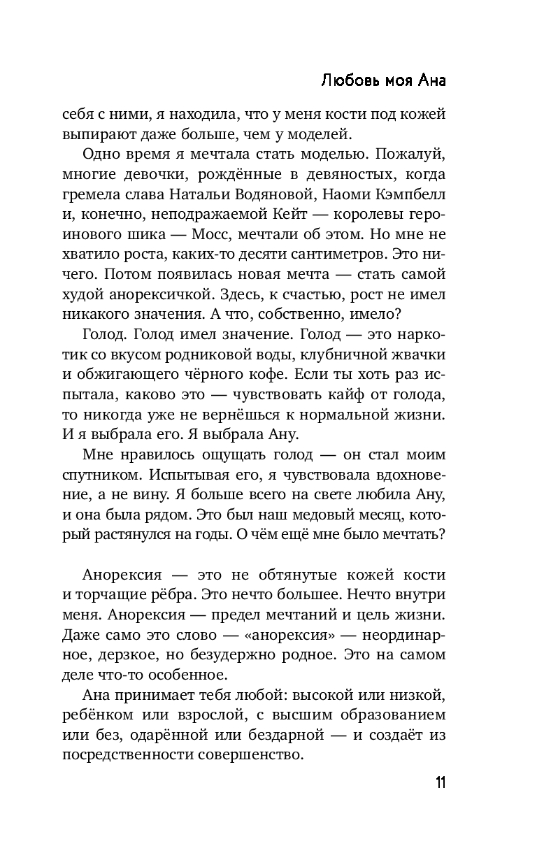 "Ана" – божественное олицетворение болезни, которая заставляет девочек и женщин вставать на путь медленного самоубийства. Она может начаться с невинной диеты, а закончиться трагическим исходом. История жизни с анорексией рассказана изнутри болезни – честно, без украшательств и замалчиваний. Где-то вдалеке будет мелькать непростой путь к исцелению, состоящий из срывов, голода, отвесов, снова срывов и тотального непонимания окружающих.