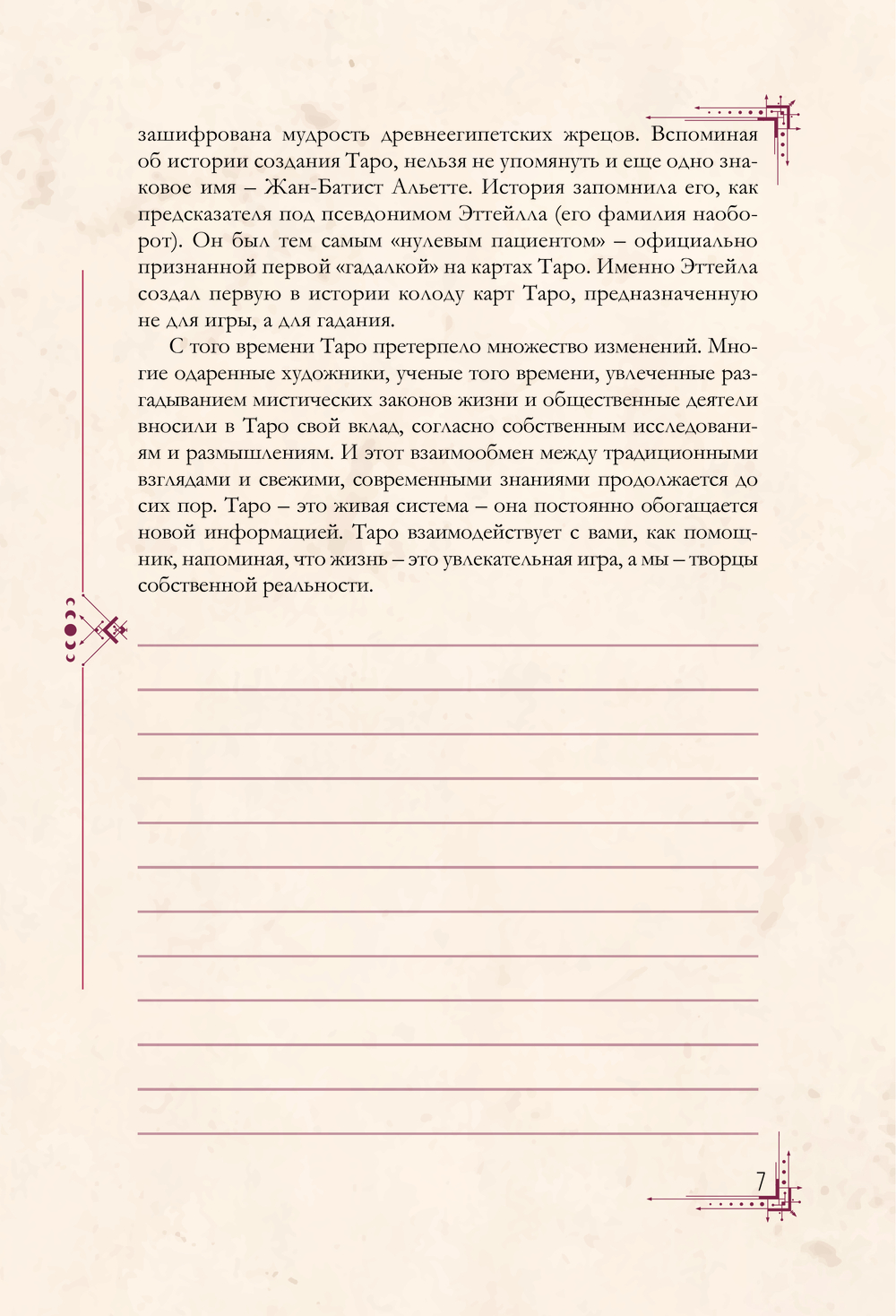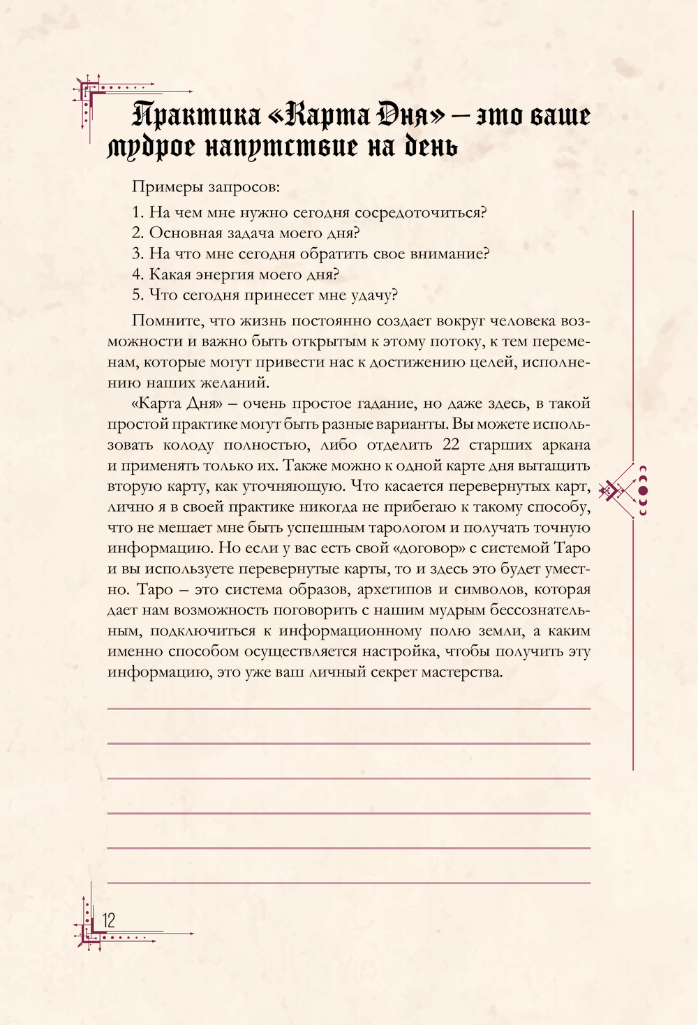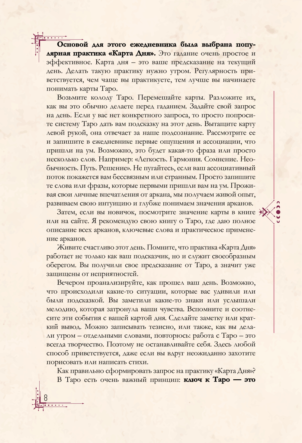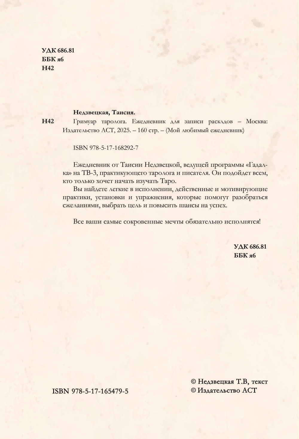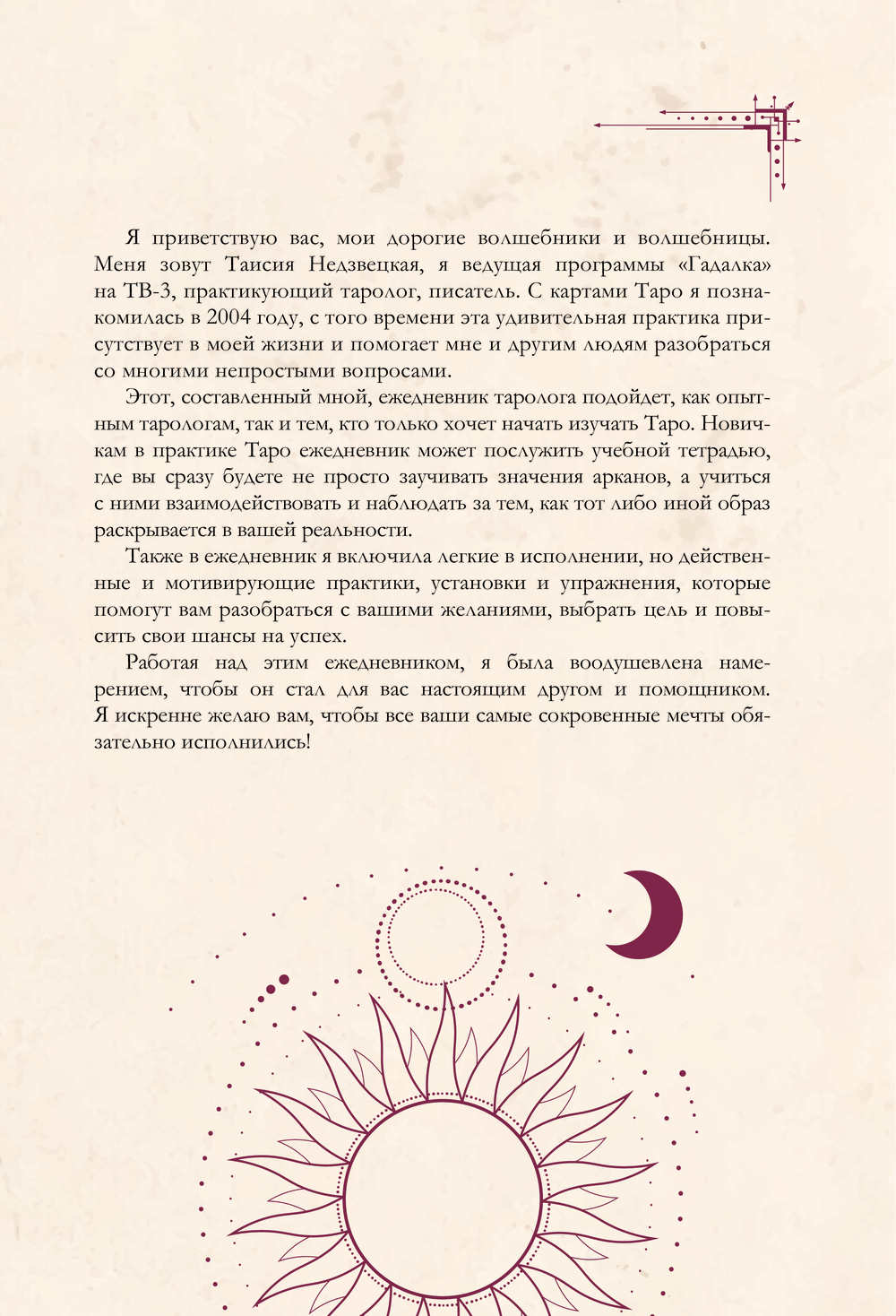 Ежедневник от Таисии Недзвецкой, ведущей программы "Гадалка" на ТВ-3, практикующего таролог и писателя. Он подойдет всем, кто только хочет начать изучать Таро. Вы найдете легкие в исполнении, действенные и мотивирующие практики, установки и упражнения, которые помогут разобраться с желаниями, выбрать цель и повысить шансы на успех.