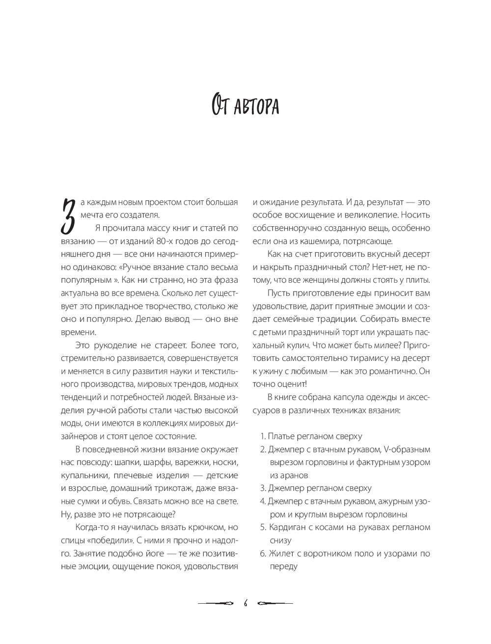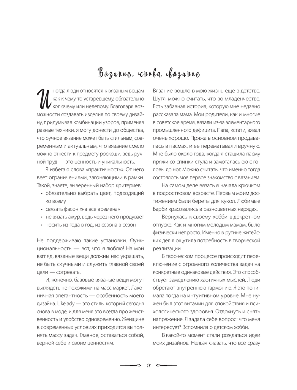 В этой необычной книге Анастасия Романова, популярный мастер, дизайнер вязаных изделий и кулинарный блогер, объединила две свои любимые сферы – кулинарию и вязание. И разработала роскошную вязаную капсулу одежды и аксессуаров с собственноручно написанными описаниями, дополнив ее вкусными и эстетичными завтраками и десертами, рецепты которых частично привезла из Италии, частично позаимствовала у своей бабушки, частично придумала самостоятельно! Что же объединяет эти два занятия? Эстетика, стилистика, а главное – настоящая женщина находит источник вдохновения не где-то далеко, а здесь и сейчас, возможно, прямо на кухне. Платье, джемпер, кардиган, свитер, жилет, шапка, шарф, палантин, варежки, берет. Тирамису, кекс, блины, печенье, пирог, пирожки, оладьи, сырники, пончики, галеты, кули. И все это красиво, вкусно, эстетично, с роскошными фотографиями. Все мастер-классы протестированы множеством ввязальщиц, все рецепты проверены на собственной семье. Настоящая магия современной женщины, вокруг которой все красиво, стильно и вкусно! Готовьте с любовью – вяжите с удовольствием!