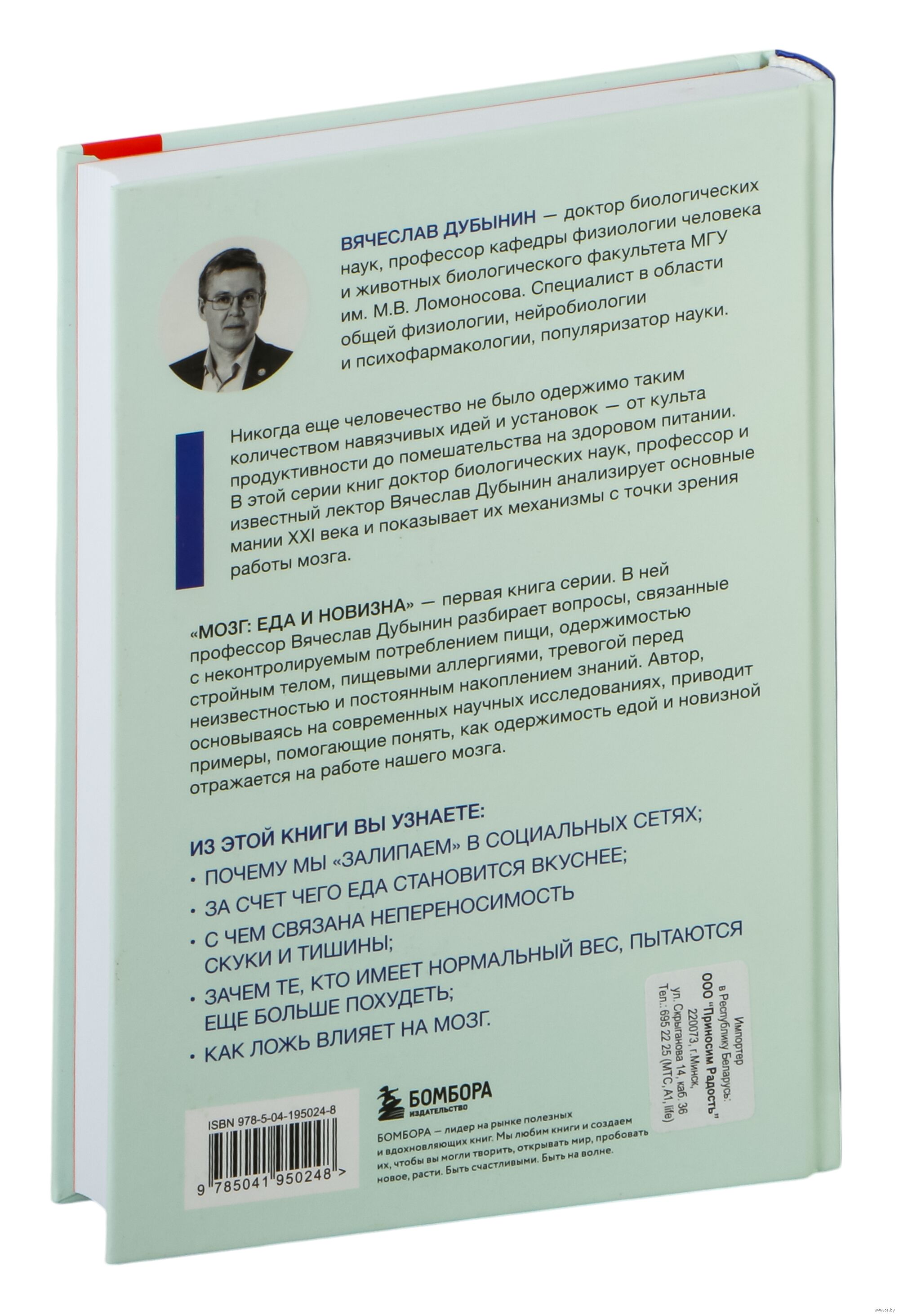 "Еда и новизна" – первая книга серии. В ней профессор Вячеслав Дубынин разбирает вопросы, связанные с неконтролируемым потреблением пищи, одержимостью стройным телом, пищевыми аллергиями, тревогой перед неизвестностью и постоянным накоплением знаний. Автор, основываясь на современных научных исследованиях, приводит примеры, помогающие понять, как одержимость едой и новизной отражается на работе нашего мозга.