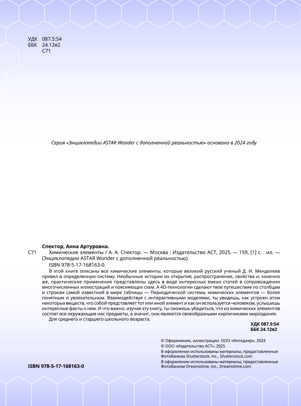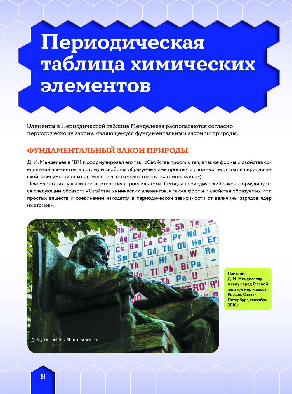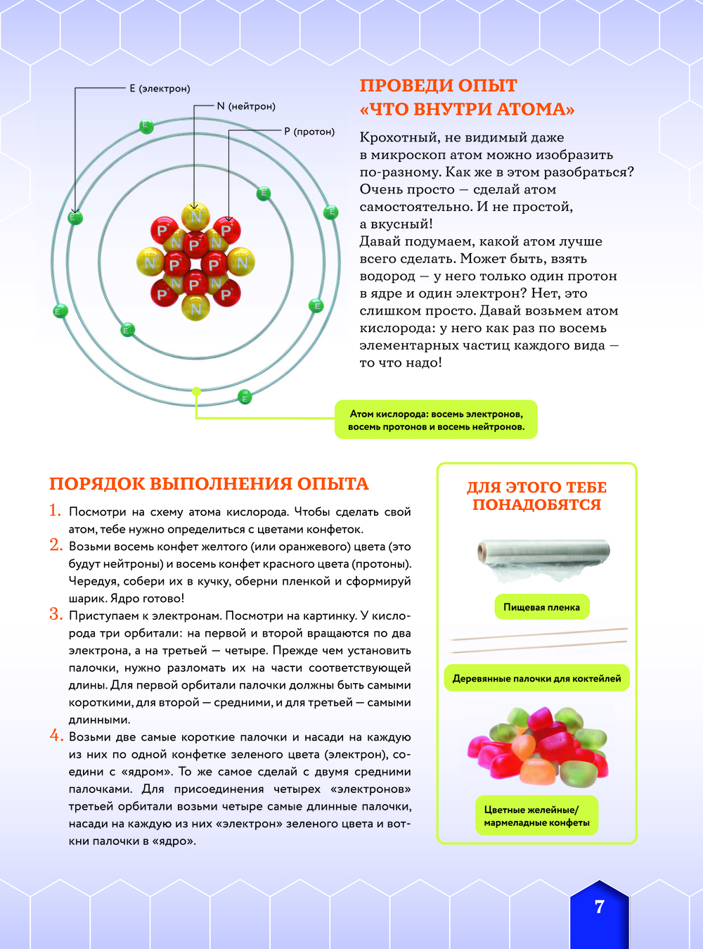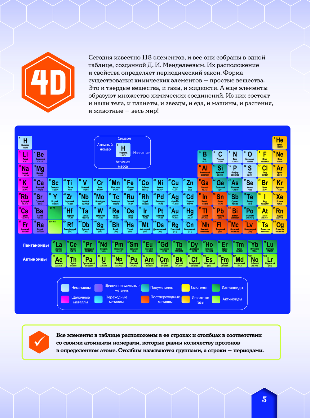 В этой книге описаны все химические элементы, которые великий русский ученый Д. И. Менделеев привел в определенную систему. Необычные истории их открытия, распространение, свойства и, конечно же, практическое применение представлены здесь в виде интересных емких статей в сопровождении многочисленных иллюстраций и поясняющих схем. А 4D-технологии сделают твое путешествие по столбцам и строкам самой известной в мире таблицы – Периодической системы химических элементов – более понятным и увлекательным. Взаимодействуя с интерактивными моделями, ты увидишь, как устроен атом некоторых веществ, что собой представляет тот или иной элемент и как он используется человеком, услышишь интересные факты о нем. И что важно, изучая эту книгу, ты сможешь убедиться, что из химических элементов состоят все окружающие нас предметы, а значит, они являются своеобразными кирпичиками мироздания.