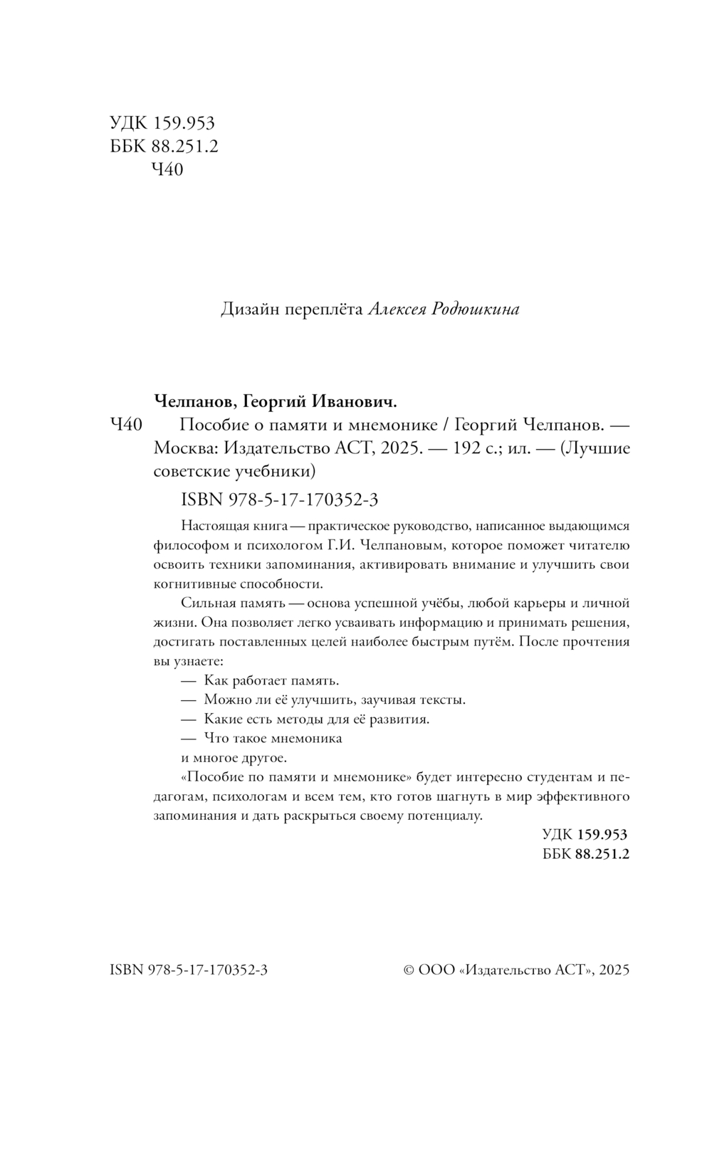 Настоящая книга – практическое руководство, написанное выдающимся философом и психологом Г.И. Челпановым, которое поможет читателю освоить техники запоминания, активировать внимание и улучшить свои когнитивные способности.