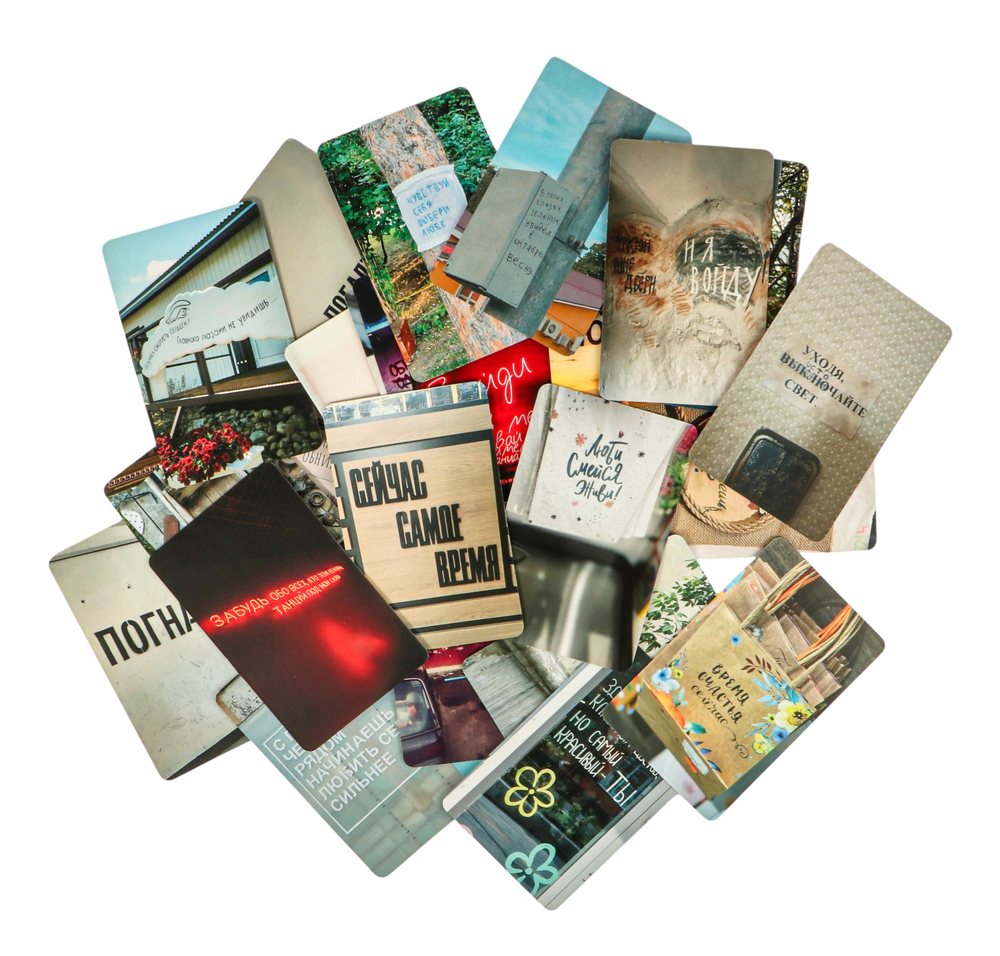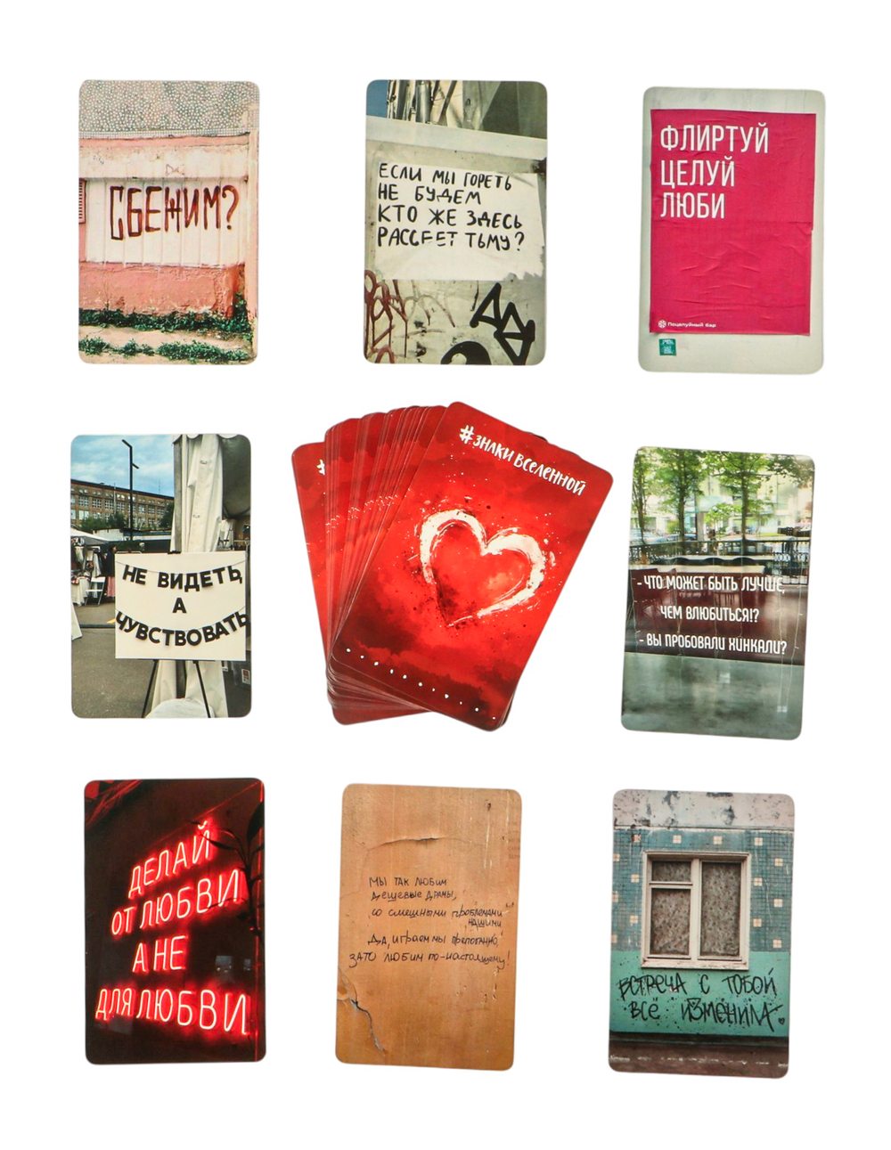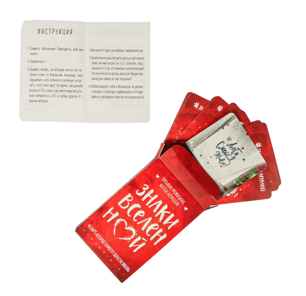 Если задать вопрос Вселенной, она обязательно ответит. Даст знак. Это может быть граффити на стене, рекламный плакат или надпись на футболке прохожего. С авторской колодой знаков Татьяны Мужицкой и Антона Нефедова вам не придется долго бродить по улицам в ожидании послания свыше. Карты в этой колоде – не просто изображения, это история одного из нас, одного знака, одной рожденной мысли, одного принятия и многих реальных шагов, которые меняют нашу жизнь к лучшему. Авторы собирали эти знаки по всей стране, чтобы сейчас вы смогли расслабиться и поговорить со Вселенной.