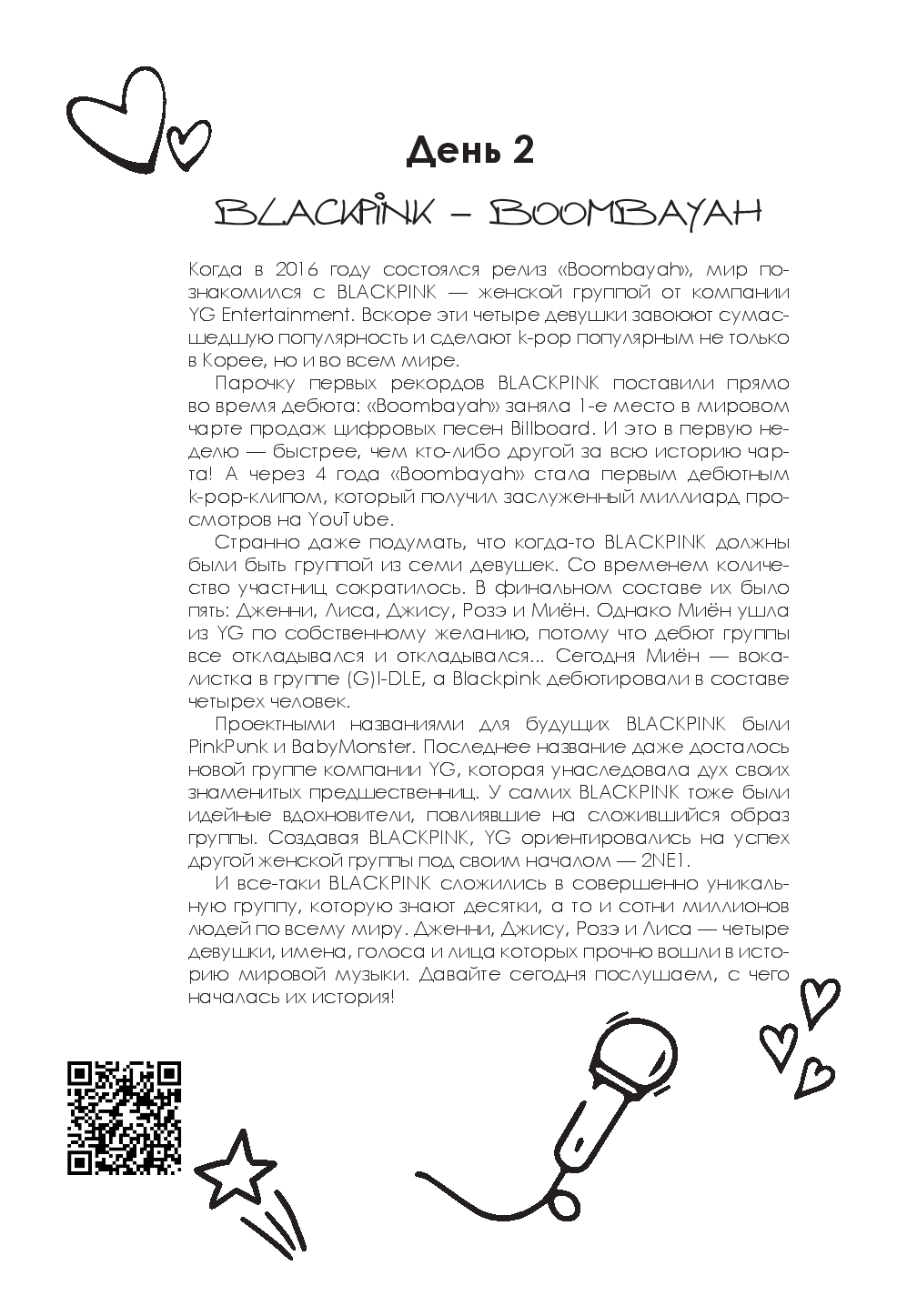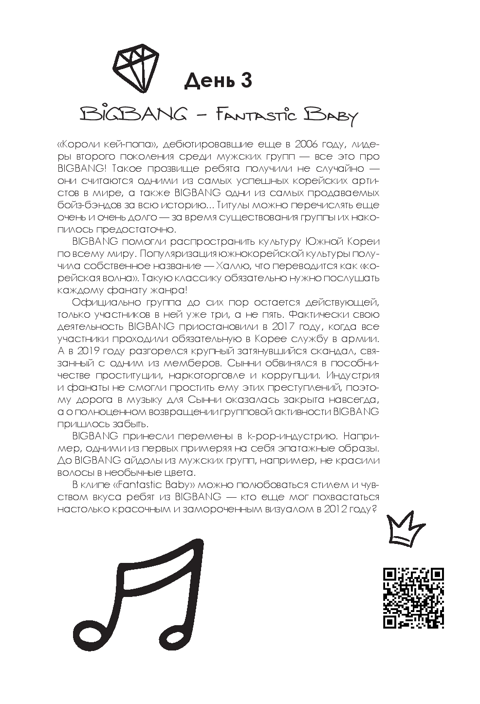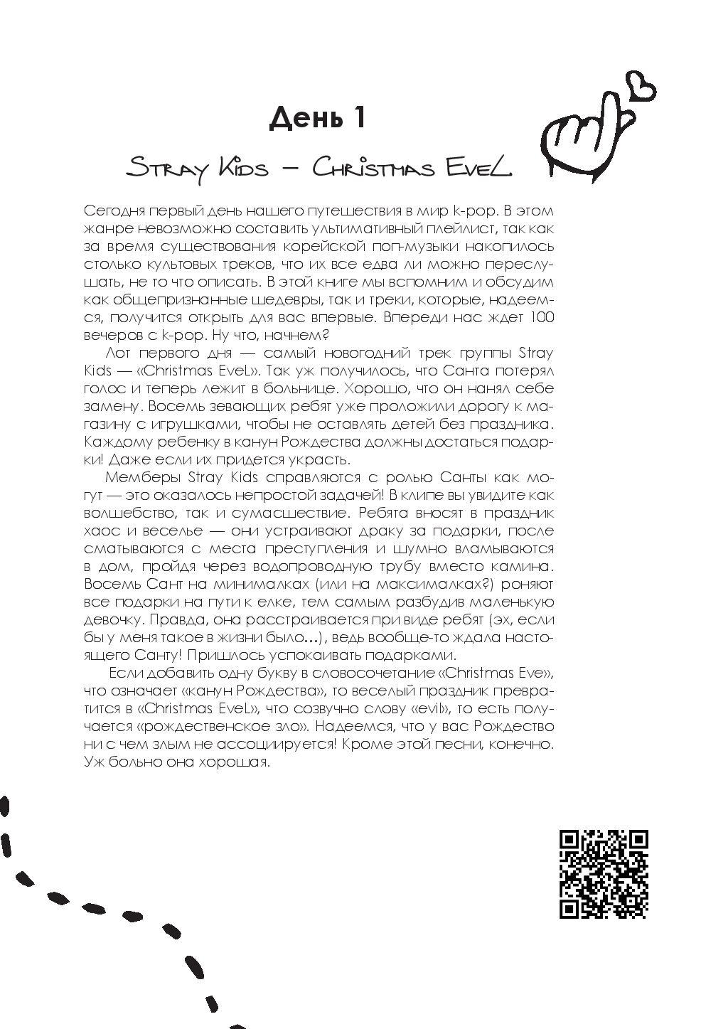 В этой книге рассказывается о 100 песнях в жанре k-pop, за каждой из которых своя история. Узнайте историю хитов группы BTS, с чего началось восхождение Stray kids на вершину музыкальных чартов, стиль какой музыкальной группы переняла для одной из своих песен группа ATEEZ, какие смыслы вкладывала в свои песни (G)I-DLE – и многое другое! Книга позволит погрузиться в мир корейской популярной музыки и провести 100 незабываемых вечеров!