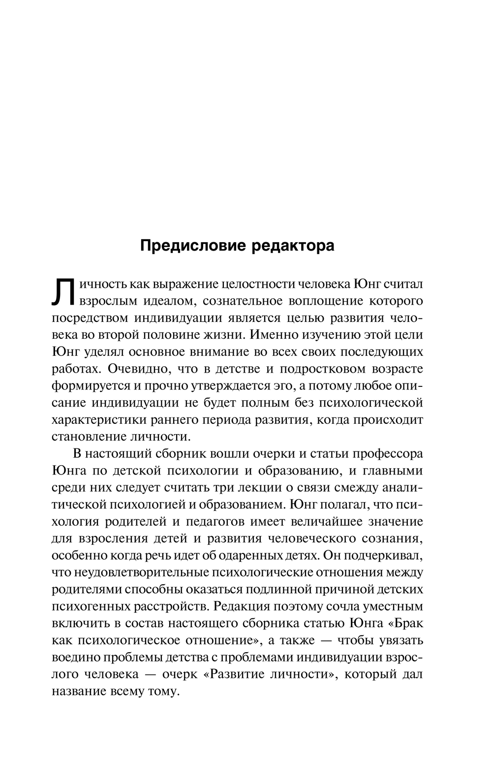 В настоящий сборник включены лекции под общим названием "Аналитическая психология и воспитание", доклад "Развитие личности", прочитанный Юнгом в венском Культурном союзе, – о влиянии детских травм на дальнейшую индивидуацию, статьи "Брак как психологическое отношение", "О конфликтах детской души", "Одаренный ребенок" и другие работы.