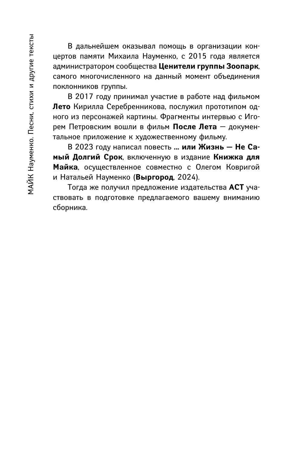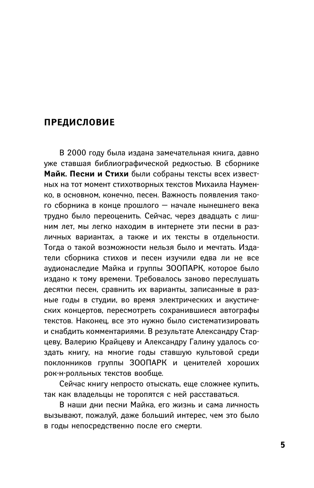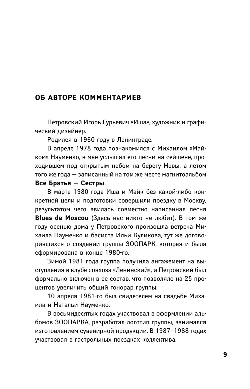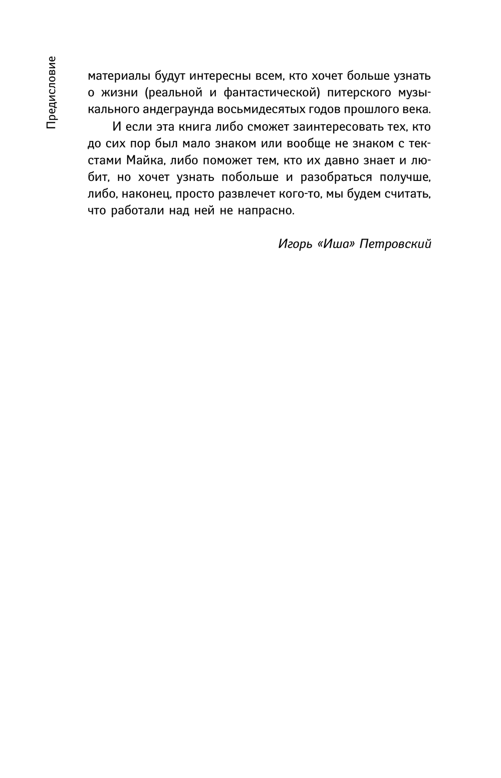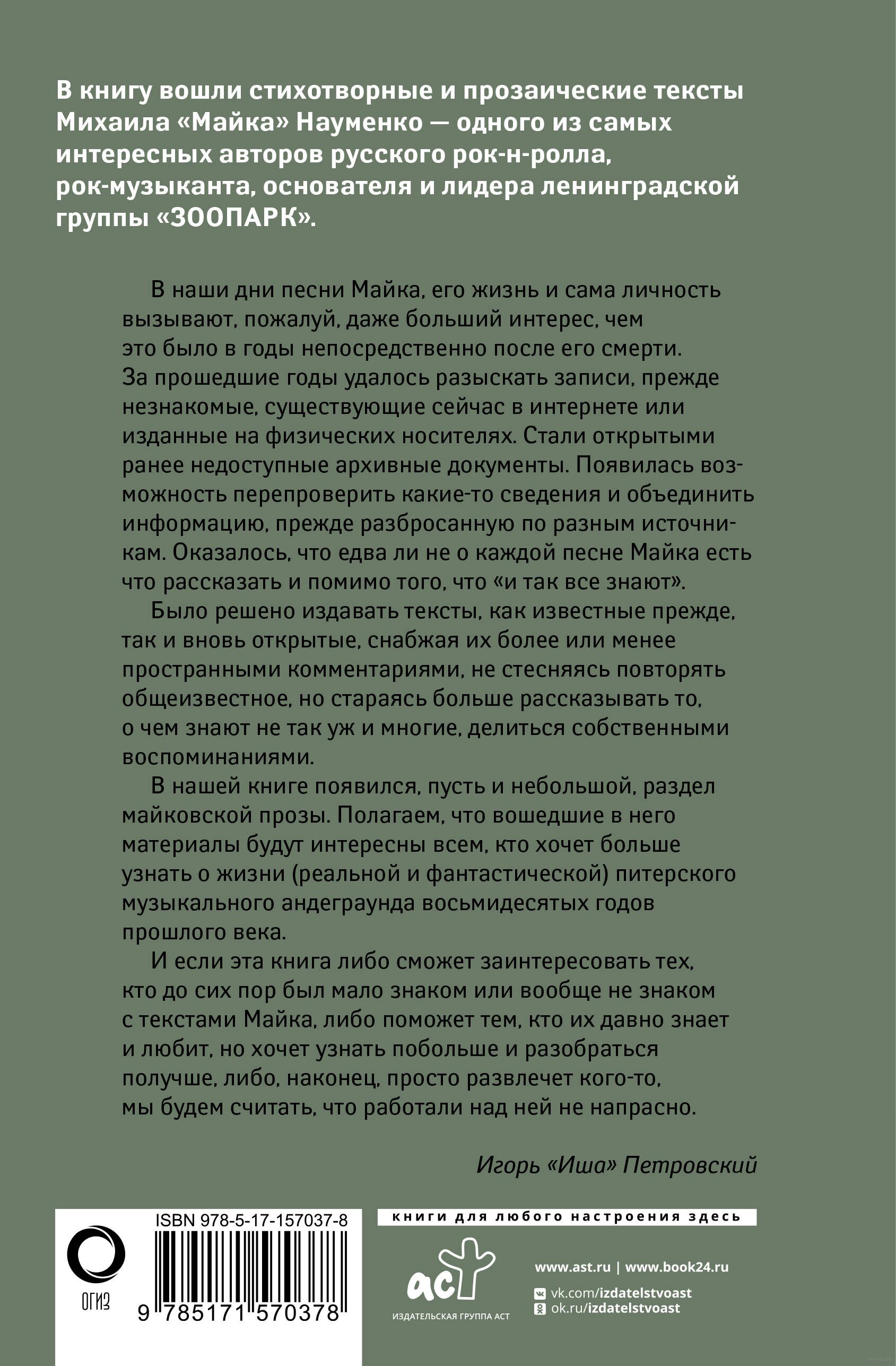 основателя и лидера ленинградской группы "Зоопарк". Комментарии к текстам и воспоминания написал Игорь "Иша" Петровский – близкий друг Майка, художник группы "Зоопарк", графический дизайнер.