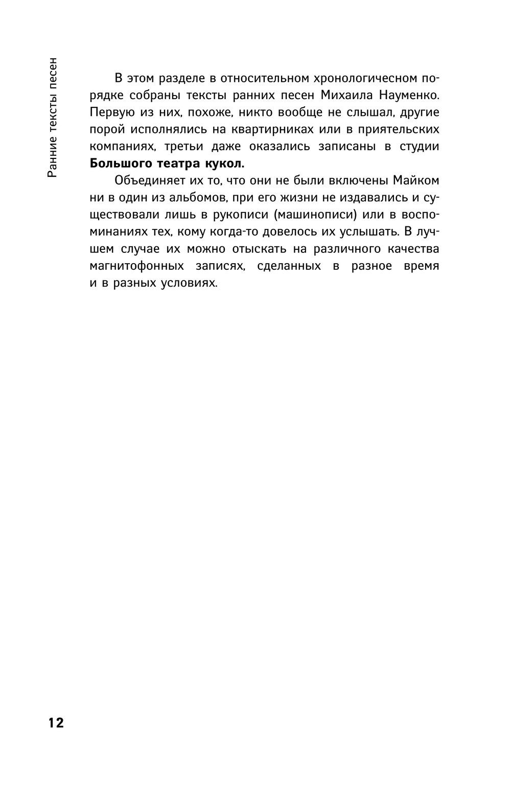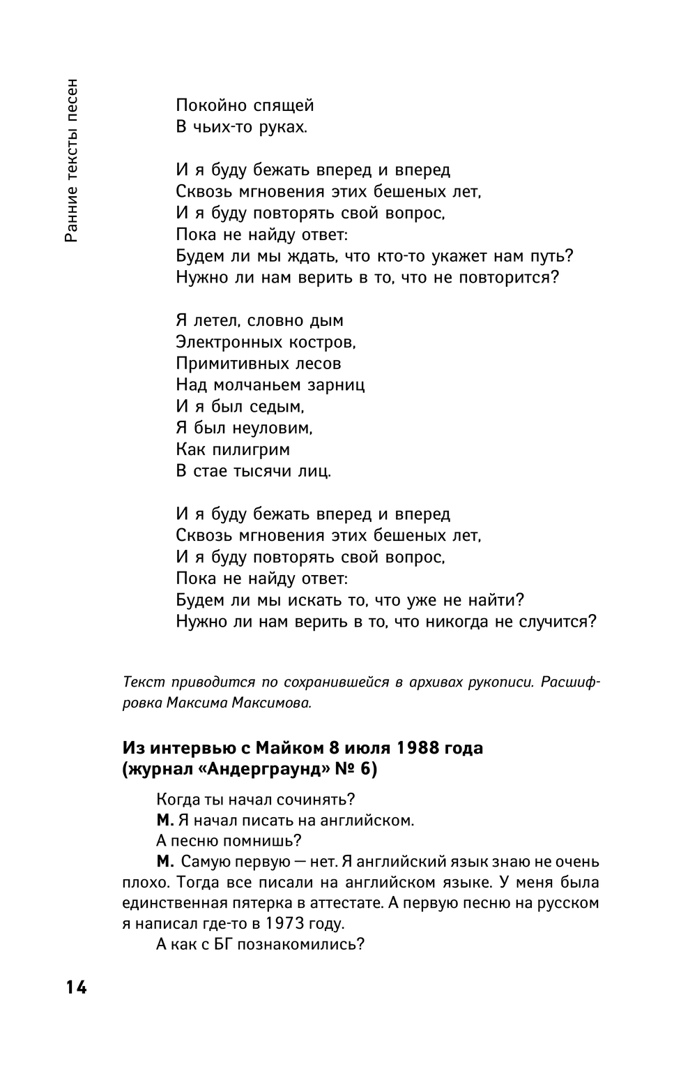 Книга заинтересует тех, кто до сих пор был мало знаком или вообще не знаком с текстами Майка, либо поможет тем, кто их давно знает и любит, но хочет узнать побольше и разобраться получше.