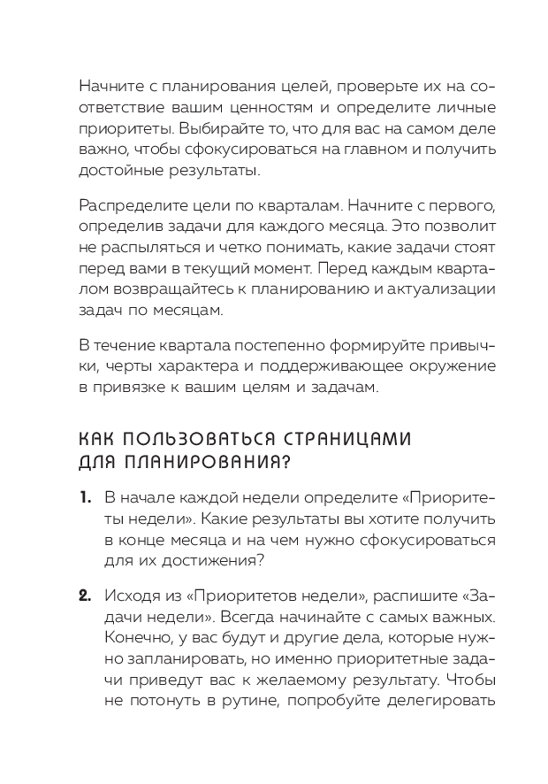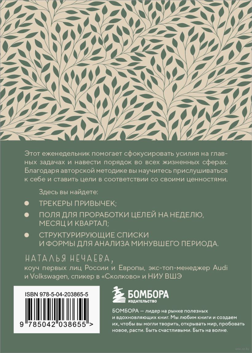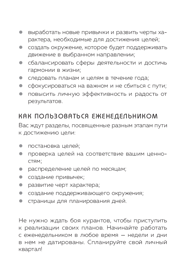 Популярный еженедельник теперь в мини формате ежедневника на квартал. Программа преображения жизни за 52 недели с помощью постановки приоритетов. Помогает сфокусировать усилия на главных задачах и навести порядок во всех жизненных сферах. Содержит трекеры привычек, поля для проработки целей на неделю, квартал и год, структурирующие списки и формы для анализа минувшего периода. Еженедельник создан на основе системы Натальи Нечаевой – экс-топ-менеджера Audi и Volkswagen, спикера в "Сколково" и НИУ ВШЭ.